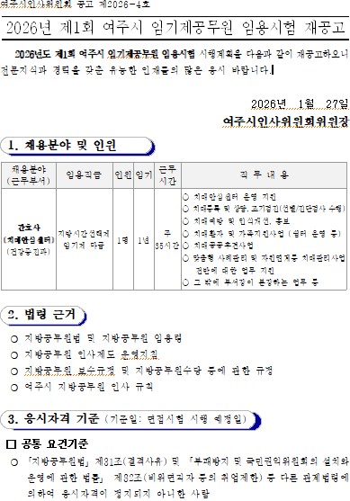 외부공지 [여주시]2026년 제1회 여주시 지방임기제공무원 임용시험 재공고 안내 2026.01.27 조회수 178 취업지원팀 share facebook twitter kakaotalk 카카오톡 앱이설치된 모바일 기기에서만공유 가능합니다. https://www.syu.ac.kr/ces0 share 복사 제1회-임용시험-재공고문간호사치매안심센터_배포용.hwp (98.5 KB) 제1회-임용시험-제출서류_재공고.hwp (82.5 KB) facebook twitter kakaotalk 카카오톡 앱이설치된 모바일 기기에서만공유 가능합니다. 이전글 글이 없습니다. 다음글 [마포진로직업체험지원센터]2026 ‘대학생진로멘토단 DA:ON’ 대학생 멘토 모집 안내 목록