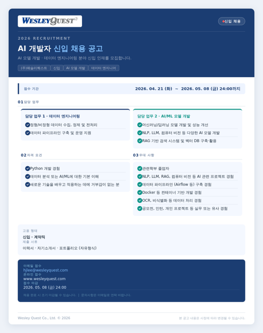 외부공지 웨슬리퀘스트 _ AI 모델 개발, 데이터 엔지니어 인턴 채용공고 2026.04.22 조회수 139 취업지원팀 share facebook twitter kakaotalk 카카오톡 앱이설치된 모바일 기기에서만공유 가능합니다. https://www.syu.ac.kr/yqk7 share 복사 facebook twitter kakaotalk 카카오톡 앱이설치된 모바일 기기에서만공유 가능합니다. 이전글 (주)한섬 2026년 신입사원 채용 (~5.5) 다음글 [SK그룹] 채용연계과정 SKALA 4기생성형 AI 서비스 개발 과정 모집 (~5/13(수) 17:00까지) 목록