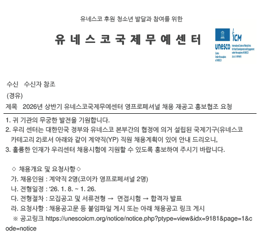 외부공지 [유네스코국제무예센터]2026년 상반기 유네스코국제무예센터 영프로페셔널 채용 재공고 2026.01.09 조회수 25 취업지원팀 share facebook twitter kakaotalk 카카오톡 앱이설치된 모바일 기기에서만공유 가능합니다. https://www.syu.ac.kr/zbvp share 복사 별지-묶음.zip (161.1 KB) facebook twitter kakaotalk 카카오톡 앱이설치된 모바일 기기에서만공유 가능합니다. 이전글 글이 없습니다. 다음글 [지식재산처]모두의 아이디어 개시 안내 목록