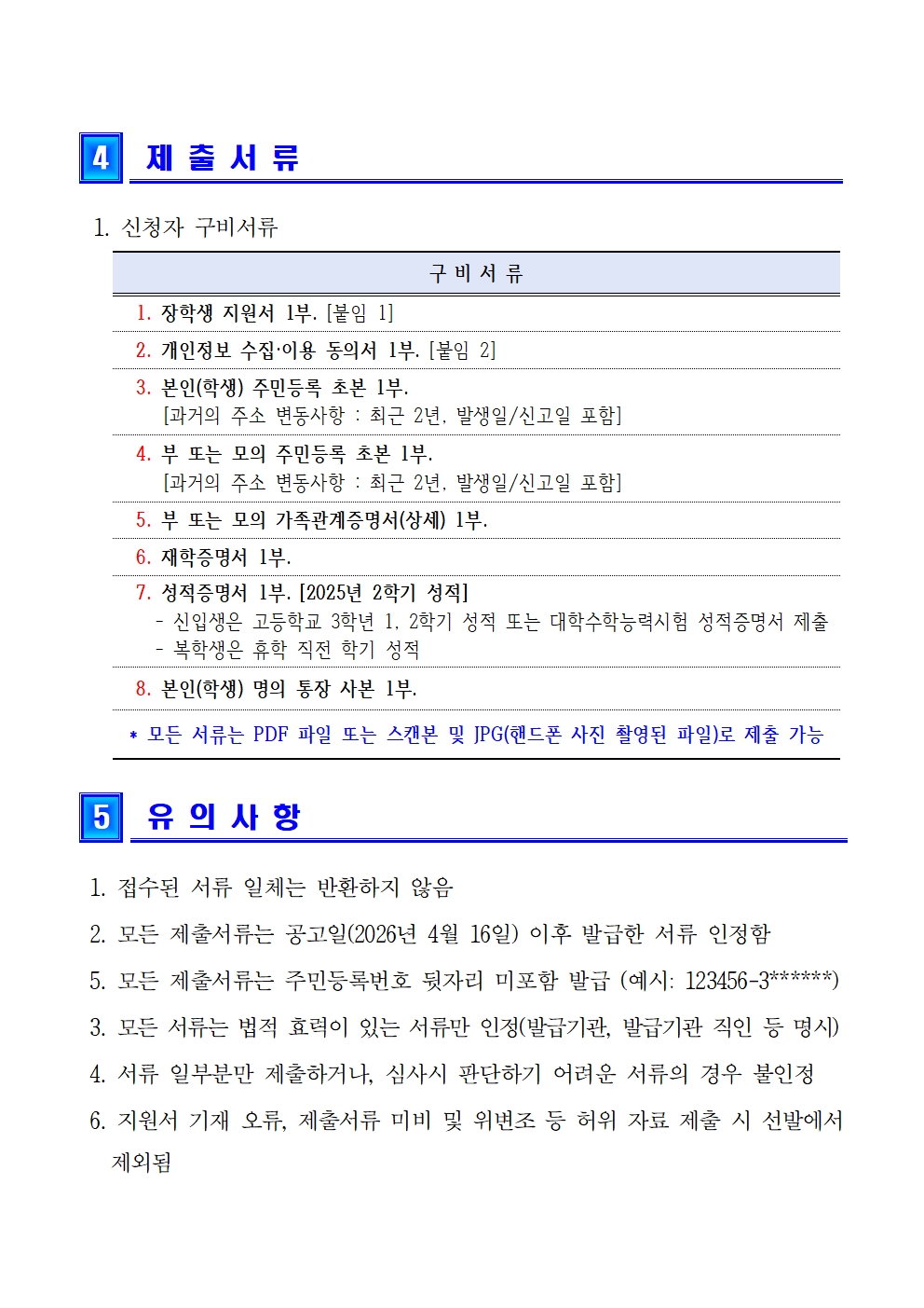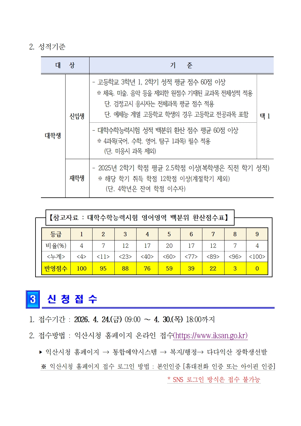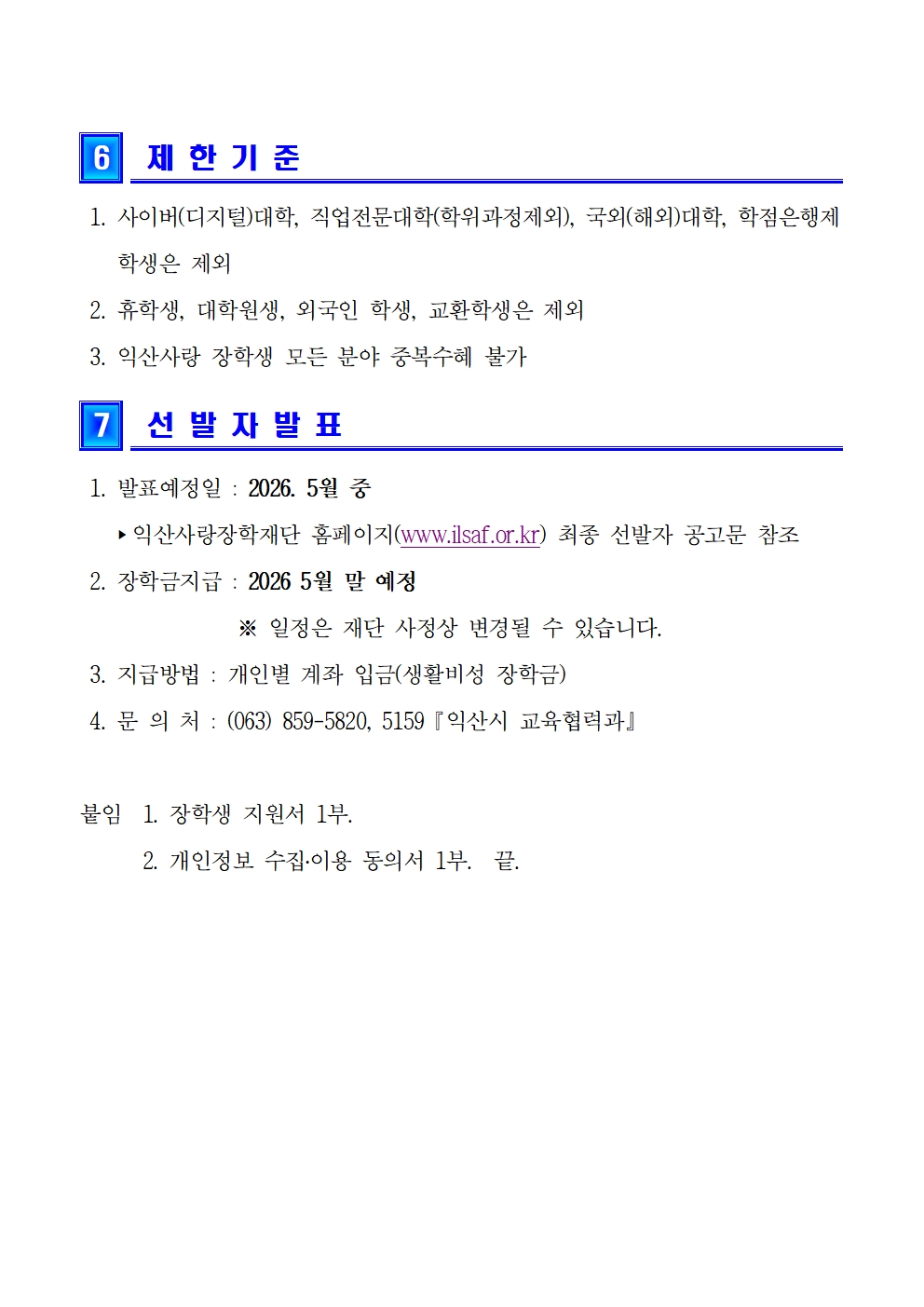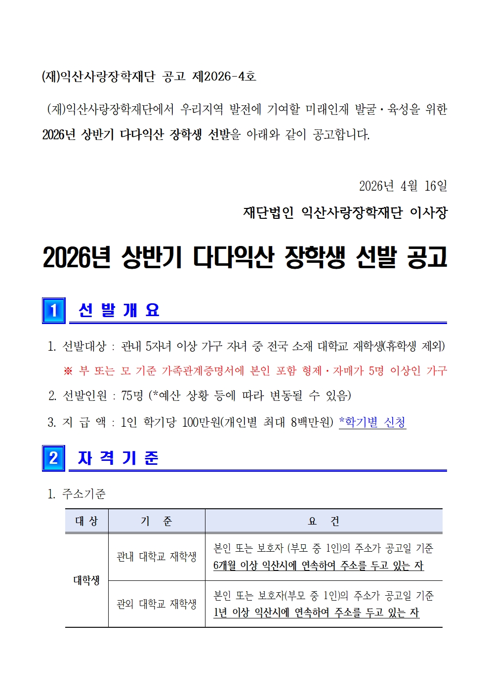 장학공지 [익산시] 2026년 상반기 다다익산 장학생 선발 안내 2026.04.17 조회수 62 학생처 share facebook twitter kakaotalk 카카오톡 앱이설치된 모바일 기기에서만공유 가능합니다. https://www.syu.ac.kr/4syn share 복사 I 2026년 상반기 다다익산 장학생 선발 안내 I 상세 내용은 아래 및 첨부파일을 확인하시어 반드시 해당 기관(단체)에 문의 혹은 홈페이지를 참고하시기 바랍니다. (아래의 그림을 클릭 시 해당 기관 홈페이지로 이동됩니다) 공고문2026년-상반기-다다익산-장학생-선발.hwp (142.5 KB) facebook twitter kakaotalk 카카오톡 앱이설치된 모바일 기기에서만공유 가능합니다. 이전글 글이 없습니다. 다음글 [서울특별시] 서울런 동행멘토단 예체능 전공 대학생 모집 안내 목록