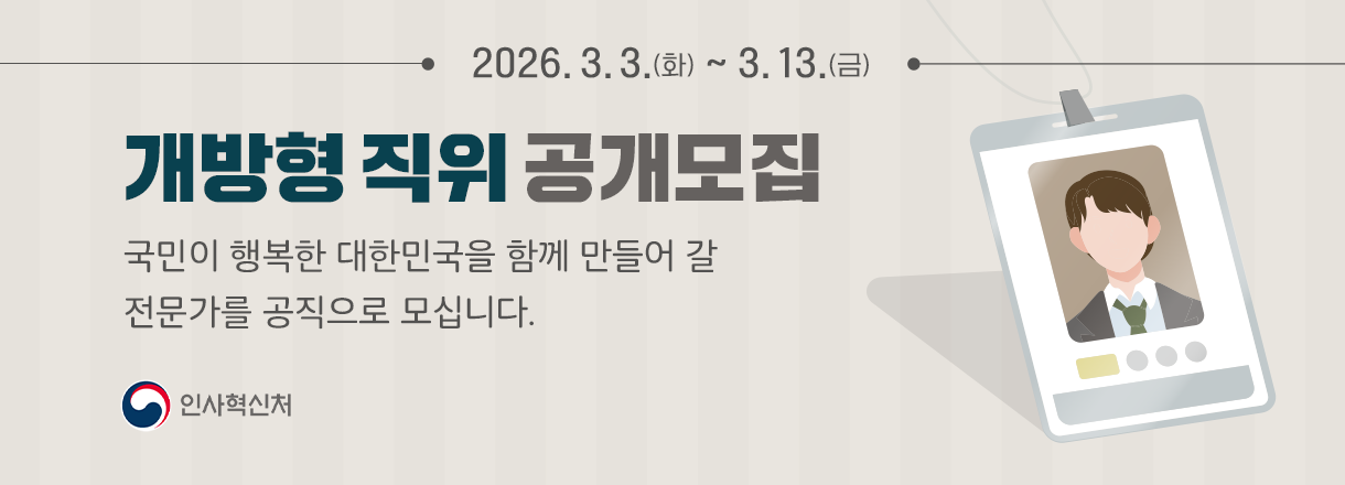 외부공지 [인사혁신처] 2026년 3월 개방형 지위 공개모집 2026.03.05 조회수 98 취업지원팀 share facebook twitter kakaotalk 카카오톡 앱이설치된 모바일 기기에서만공유 가능합니다. https://www.syu.ac.kr/eo64 share 복사 1.-2026년-3월-개방형-직위-공개모집-안내-1.hwpx (67.6 KB) 3월-개방형직위-카드뉴스-한컷파일.pdf (1.3 MB) 3.-2026년-3월-개방형-직위-직위안내자료.zip (2.7 MB) facebook twitter kakaotalk 카카오톡 앱이설치된 모바일 기기에서만공유 가능합니다. 이전글 글이 없습니다. 다음글 [함안군]「2026년 함안군 숏폼 영상 콘테스트」 목록