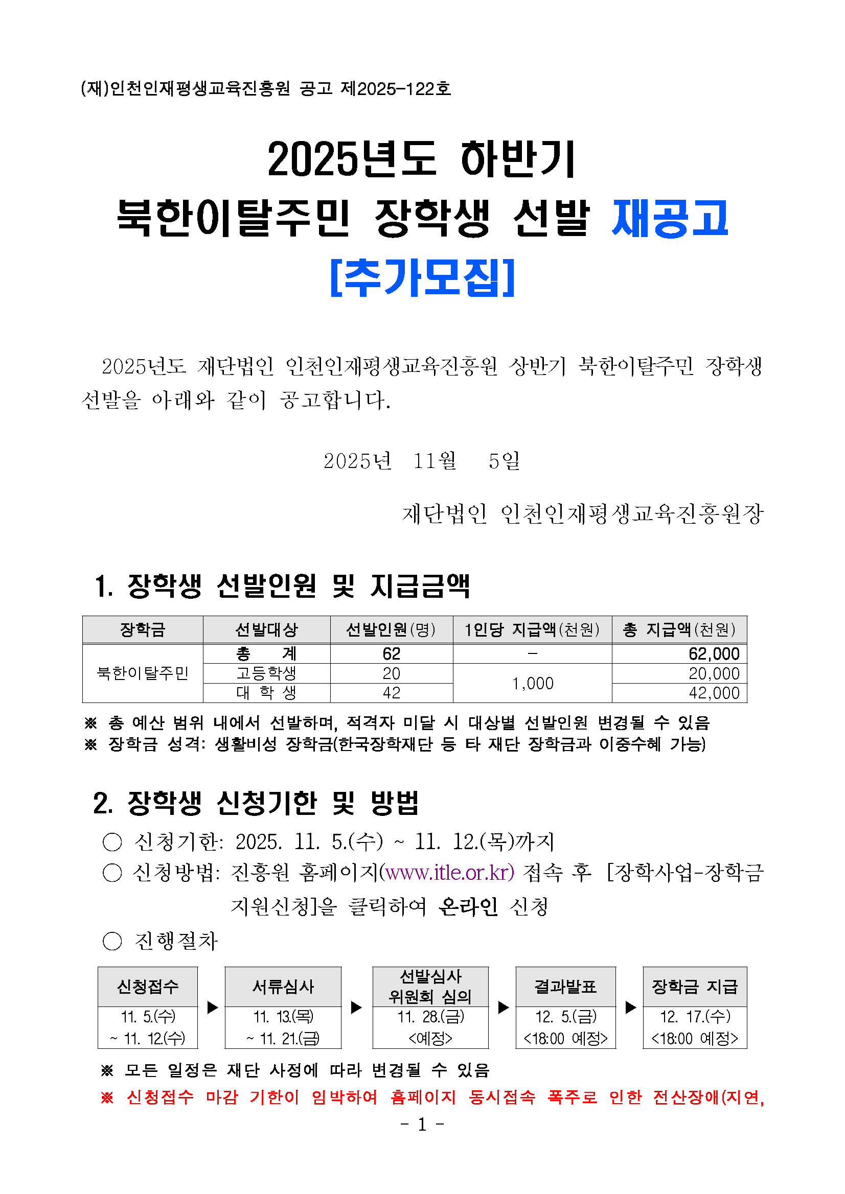 [인천인재평생교육진흥원] 2025년도 하반기 북한이탈주민 장학생 선발 재공고(추가모집)