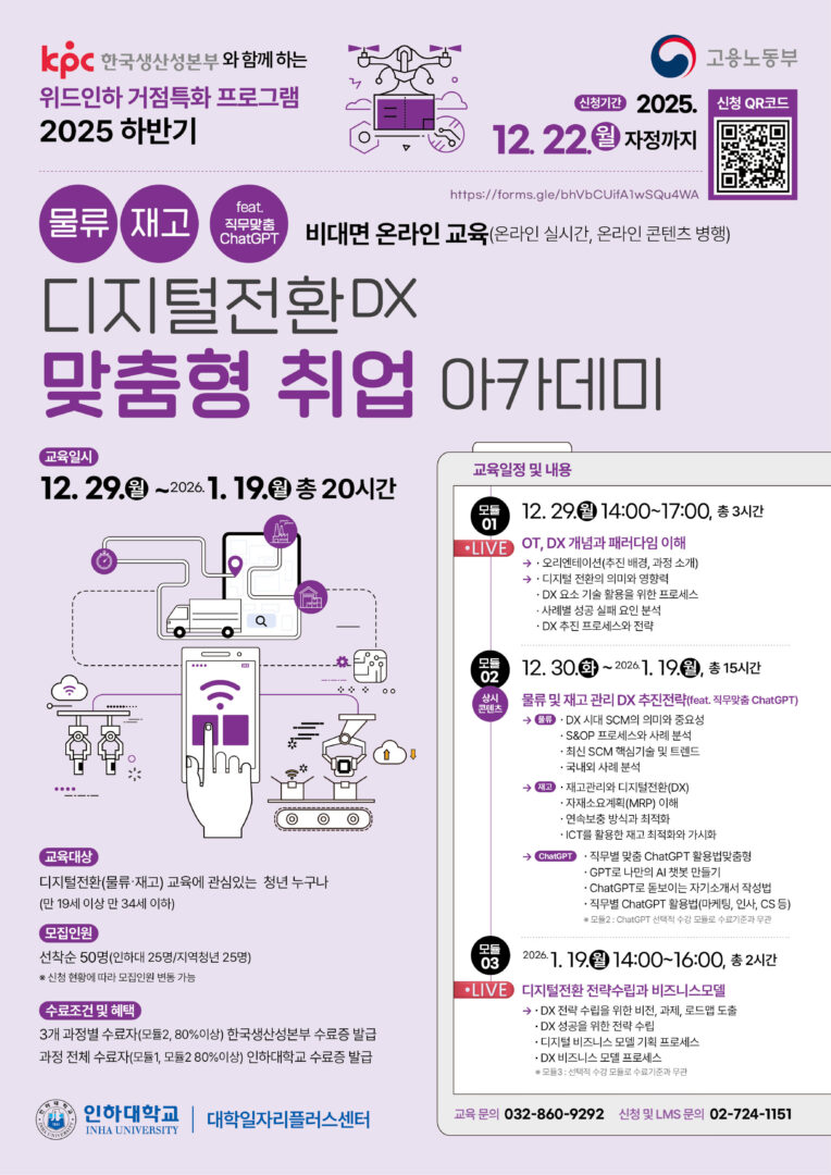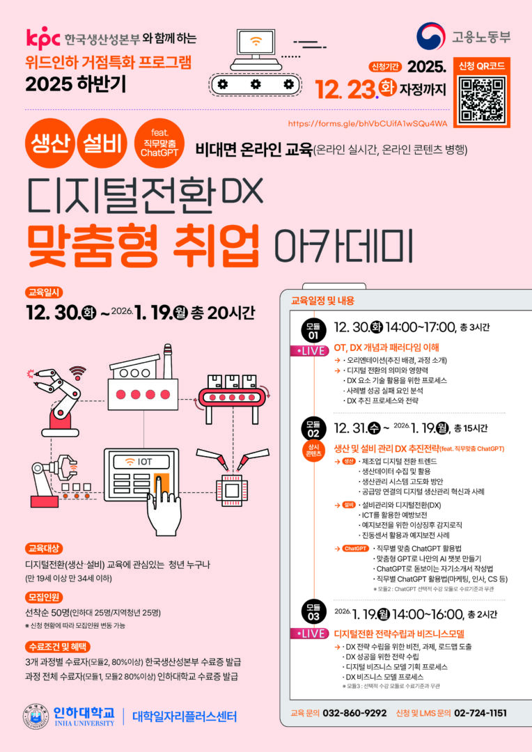 외부공지 [인하대학교] 한국생산성본부와 함께하는 “디지털전환(DX) 맞춤형 취업 아카데미” 홍보 안내 2025.12.09 조회수 122 취업지원팀 share facebook twitter kakaotalk 카카오톡 앱이설치된 모바일 기기에서만공유 가능합니다. https://www.syu.ac.kr/ucmq share 복사 facebook twitter kakaotalk 카카오톡 앱이설치된 모바일 기기에서만공유 가능합니다. 이전글 행사디지털서비스 서밋 2025 with PlugFest 행사안내 다음글 [그랜드코리아레저(주)] 2026년 제1차 융복합 관광인재 양성교육 안내 목록