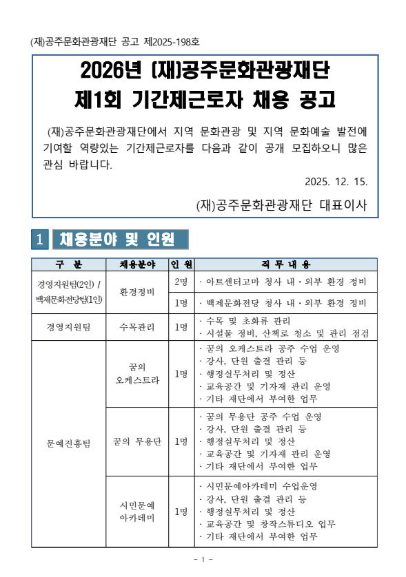 외부공지 [(재)공주문화관광재단]제1회 기간제근로자 채용 안내 2025.12.15 조회수 71 취업지원팀 share facebook twitter kakaotalk 카카오톡 앱이설치된 모바일 기기에서만공유 가능합니다. https://www.syu.ac.kr/5xea share 복사 2026년-재공주문화관광재단-제1회-기간제근로자-채용-지원서.hwp (204.5 KB) 2026년-재공주문화관광재단-제1회-기간제근로자-채용-공고문_최종-복사.pdf (328.9 KB) facebook twitter kakaotalk 카카오톡 앱이설치된 모바일 기기에서만공유 가능합니다. 이전글 글이 없습니다. 다음글 [한국장애인개발원]장애청년 채용 취업 정보 안내(12월 2차) 목록