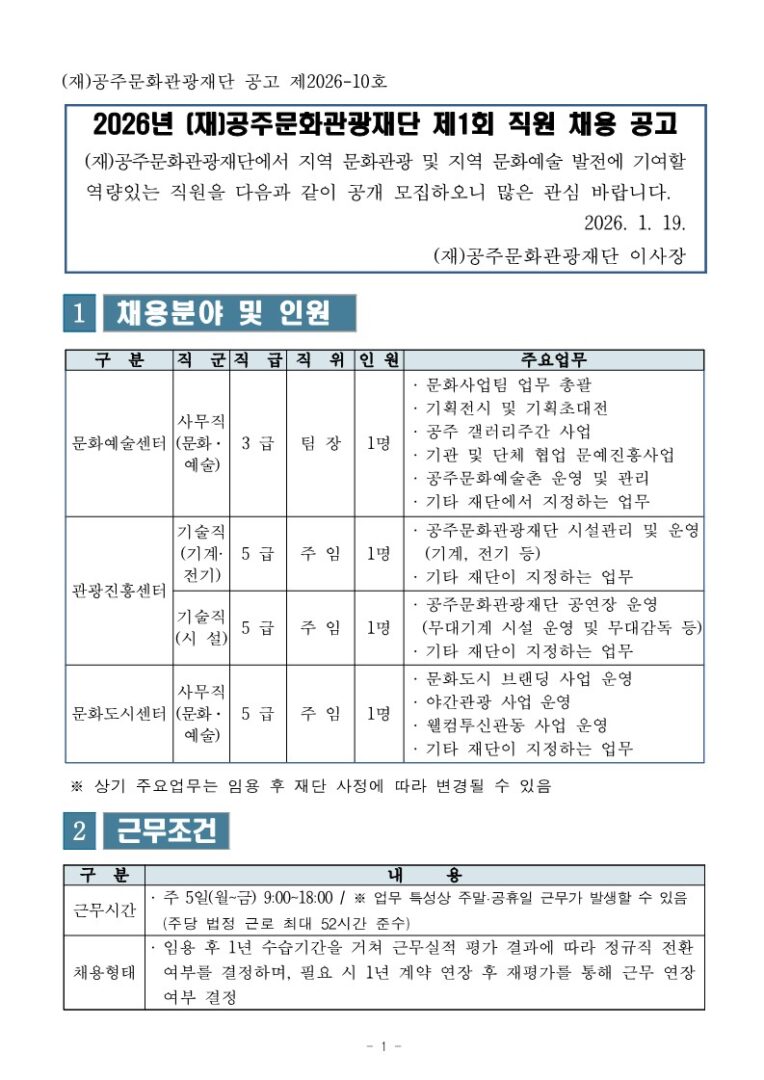 외부공지 [(재)공주문화관광재단]2026년 (재)공주문화관광재단 제1회 직원 채용 홍보 안내 2026.01.20 조회수 158 취업지원팀 share facebook twitter kakaotalk 카카오톡 앱이설치된 모바일 기기에서만공유 가능합니다. https://www.syu.ac.kr/c4v6 share 복사 2026년-재공주문화관광재단-제1회-직원-채용-공고문.pdf (211.6 KB) 2026년-재공주문화관광재단-제1회-직원-채용-지원서.hwp (216.5 KB) facebook twitter kakaotalk 카카오톡 앱이설치된 모바일 기기에서만공유 가능합니다. 이전글 [안성시]안성시 탄소중립 지원센터 연구원 채용공고 안내 다음글 [교육부]2026년도 세무직 「강원권 지역구분」 9급 공개경쟁채용시험 안내 목록