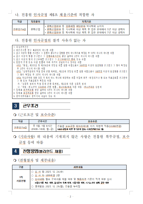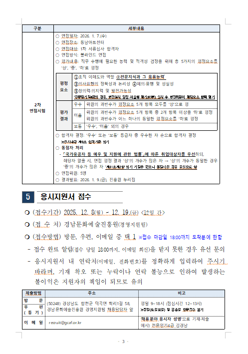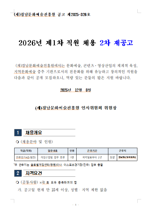 외부공지 [재단법인경남문화예술진흥원]2026년도 제1차 직원 채용(2차 재공고) 홍보 안내 2025.12.15 조회수 62 취업지원팀 share facebook twitter kakaotalk 카카오톡 앱이설치된 모바일 기기에서만공유 가능합니다. https://www.syu.ac.kr/fchy share 복사 붙임.-공고문-및-지원서식2026년도-제1차-직원-채용-2차-재공고.hwp (80.0 KB) facebook twitter kakaotalk 카카오톡 앱이설치된 모바일 기기에서만공유 가능합니다. 이전글 [한국장애인개발원]장애청년 채용 취업 정보 안내(12월 2차) 다음글 일반2026년 서울청년문화패스 신청자 모집 안내 목록