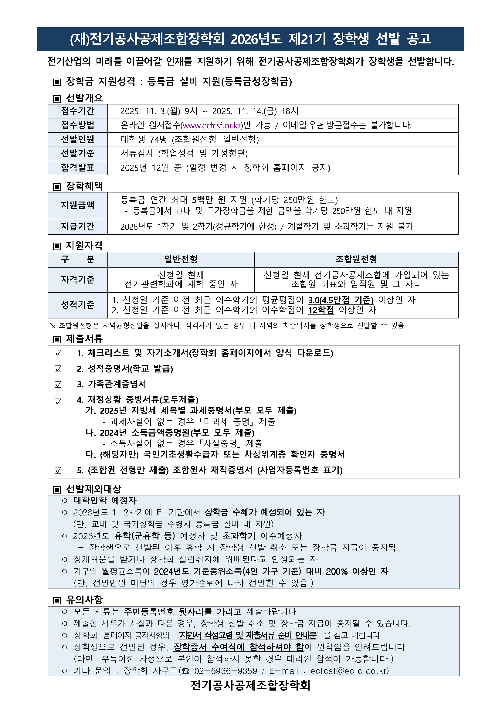 장학공지 [전기공사공제조합장학회] 2026년도 전기공사공제조합장학회 제21기 장학생 선발 안내 2025.11.06 조회수 62 학생처 share facebook twitter kakaotalk 카카오톡 앱이설치된 모바일 기기에서만공유 가능합니다. https://www.syu.ac.kr/zc97 share 복사 I 2026년도 전기공사공제조합장학회 제21기 장학생 선발 안내 I 상세 내용은 아래 및 첨부파일을 확인하시어 반드시 해당 기관(단체)에 문의 혹은 홈페이지를 참고하시기 바랍니다. (아래의 그림을 클릭 시 해당 기관 홈페이지로 이동됩니다) 붙임1-2026년도-제21기-장학생-선발-공고.pdf (189.0 KB) 붙임2-자기소개서.hwp (25.0 KB) 붙임3-체크리스트.hwp (173.5 KB) 붙임4-2026년-제21기-장학생-지원서-작성요령-및-제출서류-준비-안내.pdf (1.1 MB) facebook twitter kakaotalk 카카오톡 앱이설치된 모바일 기기에서만공유 가능합니다. 이전글 글이 없습니다. 다음글 [국가근로] 2025년 동계방학집중근로 희망근로지 신청 안내 목록
