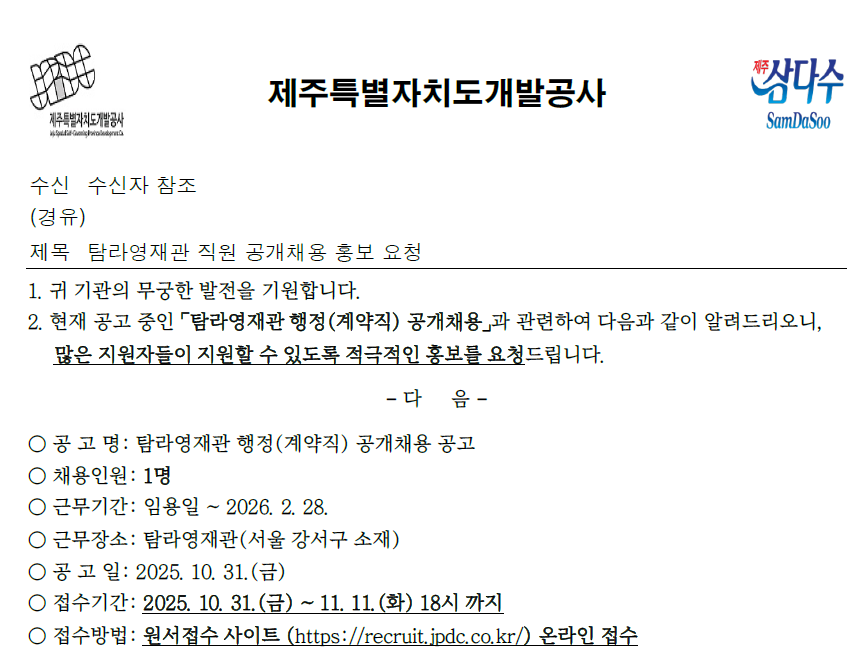 외부공지 [제주특별자치도개발공사]탐라영재관 직원 공개채용 안내 2025.11.05 조회수 25 취업지원팀 share facebook twitter kakaotalk 카카오톡 앱이설치된 모바일 기기에서만공유 가능합니다. https://www.syu.ac.kr/0zws share 복사 제주특별자치도개발공사-공고문_20251031.hwpx (86.3 KB) facebook twitter kakaotalk 카카오톡 앱이설치된 모바일 기기에서만공유 가능합니다. 이전글 [한국청년기업가정신재단]2025 글로벌 대학생 기업가정신 조사 안내 다음글 [노원구] 청년취업사관학교 노원캠퍼스 ‘노원 3기’ 교육생 모집 안내 목록