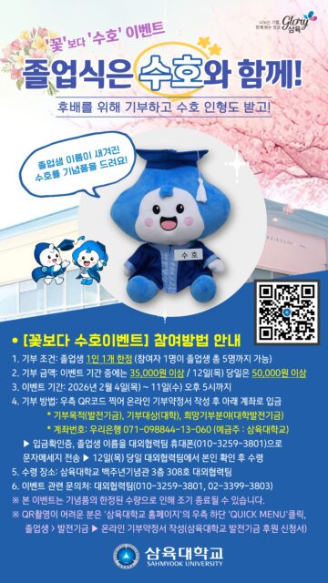 2026 꽃보다 수호 이벤트 2026 꽃보다 수호 이벤트 2026.02.09 조회수 0 대외협력팀 share facebook twitter kakaotalk 카카오톡 앱이설치된 모바일 기기에서만공유 가능합니다. https://www.syu.ac.kr/?p=238634 share 복사 facebook twitter kakaotalk 카카오톡 앱이설치된 모바일 기기에서만공유 가능합니다. 이전글 글이 없습니다. 다음글 글이 없습니다. 목록