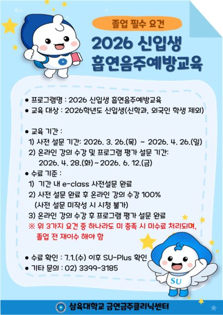 학사공지 [졸업필수요건] 2026 신입생 흡연∙음주예방교육 안내 2026.03.26 조회수 104 금연금주클리닉 share facebook twitter kakaotalk 카카오톡 앱이설치된 모바일 기기에서만공유 가능합니다. https://www.syu.ac.kr/d5aq share 복사 facebook twitter kakaotalk 카카오톡 앱이설치된 모바일 기기에서만공유 가능합니다. 이전글 글이 없습니다. 다음글 2026-1학기 장애학생 서포터즈 모집 안내(추가) 목록
