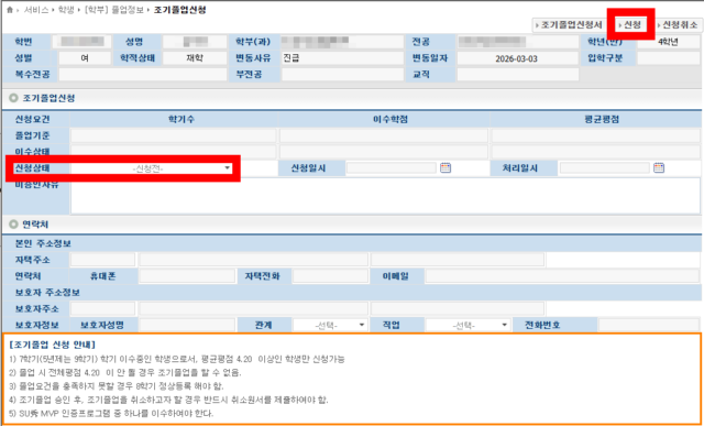 1️⃣ SU-WINGs [학생] → 학사정보 → 졸업정보 → 조기졸업신청 2️⃣ “신청상태” 확인 ![]() |
