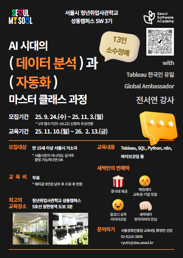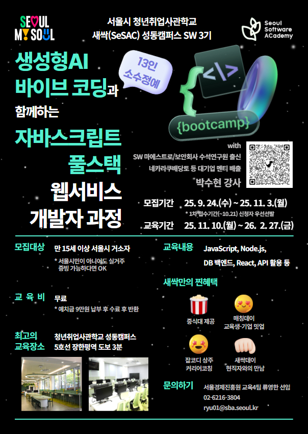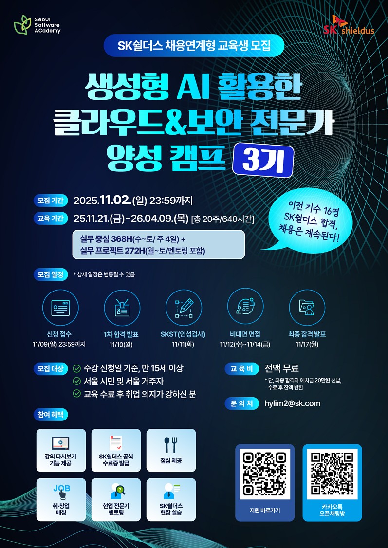 외부공지 [청년취업사관학교 성동캠퍼스 SW3기 모집] 2025.10.20 조회수 41 취업지원팀 share facebook twitter kakaotalk 카카오톡 앱이설치된 모바일 기기에서만공유 가능합니다. https://www.syu.ac.kr/mxub share 복사 facebook twitter kakaotalk 카카오톡 앱이설치된 모바일 기기에서만공유 가능합니다. 이전글 2025년 하반기 농심그룹 채용 ~10/29 다음글 중앙일보 포스브코리아 「2025 Forbes Y30 AI SUMMIT」 목록
