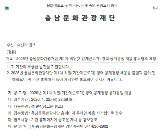외부공지 [충남문화관광재단]2026년 충남문화관광재단 제1차 직원(기간제근로자) 경력·공개경쟁 채용 안내 2026.01.09 조회수 24 취업지원팀 share facebook twitter kakaotalk 카카오톡 앱이설치된 모바일 기기에서만공유 가능합니다. https://www.syu.ac.kr/izxk share 복사 공고문제1차-채용.hwp (114.0 KB) facebook twitter kakaotalk 카카오톡 앱이설치된 모바일 기기에서만공유 가능합니다. 이전글 글이 없습니다. 다음글 [부산광역시서구청]대학생 대상 공공 워케이션「휴앤워크 서구 워케이션」이용 안내 목록