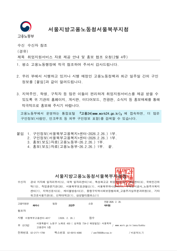 외부공지 취업지원서비스 자료 제공 안내 및 홍보(2월 4주) 2026.02.27 조회수 194 취업지원팀 share facebook twitter kakaotalk 카카오톡 앱이설치된 모바일 기기에서만공유 가능합니다. https://www.syu.ac.kr/sr1n share 복사 구인정보서울북부고용복지센터-2026.2.26.hwp (206.0 KB) 구인정보서울북부고용복지센터-2026.2.26.pdf (99.4 KB) 홍보보도자료고용노동부-26.2.26.hwp (1.5 MB) 홍보보도자료고용노동부-26.2.26.pdf (465.0 KB) facebook twitter kakaotalk 카카오톡 앱이설치된 모바일 기기에서만공유 가능합니다. 이전글 글이 없습니다. 다음글 산재신청 바로알기숏폼 영상 공모전 목록