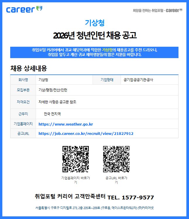 외부공지 [커리어] 2026년 기상청 청년인턴 채용 2026.04.03 조회수 671 취업지원팀 share facebook twitter kakaotalk 카카오톡 앱이설치된 모바일 기기에서만공유 가능합니다. https://www.syu.ac.kr/6a45 share 복사 커리어_홈페이지게시용_260402_기상청_v.0.1.hwpx (1.0 MB) facebook twitter kakaotalk 카카오톡 앱이설치된 모바일 기기에서만공유 가능합니다. 이전글 대구도시개발공사 2026년 신입사원 채용공고 다음글 애플코리아 Operation PM 채용 공고 목록