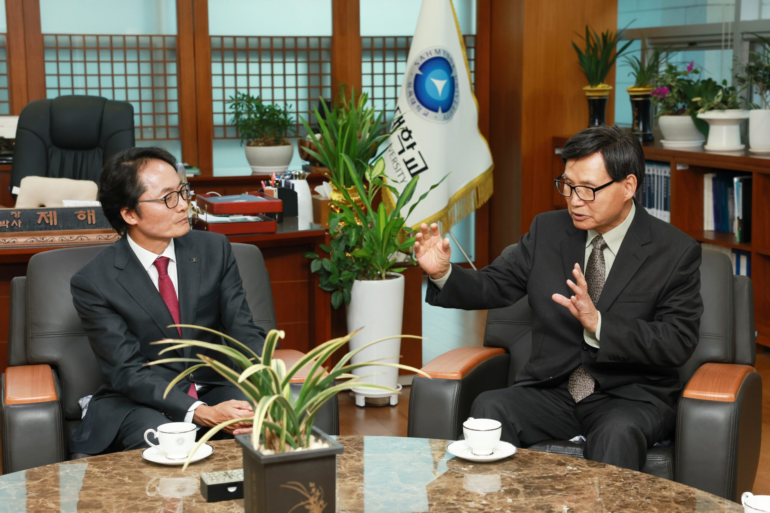 ▲ 남영한 회장(오른쪽)이 교내 총장실에서 제해종 총장과 환담을 나누고 있다.
