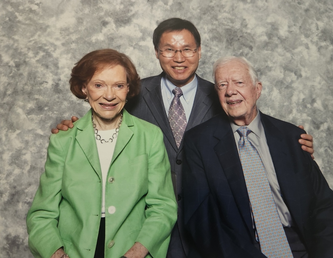▲ 남영한 회장(가운데)이 지미 카터 전 미국 대통령과 부인 로절린 카터 여사와 함께 기념촬영을 하고 있다. 사진=남영한 회장 제공