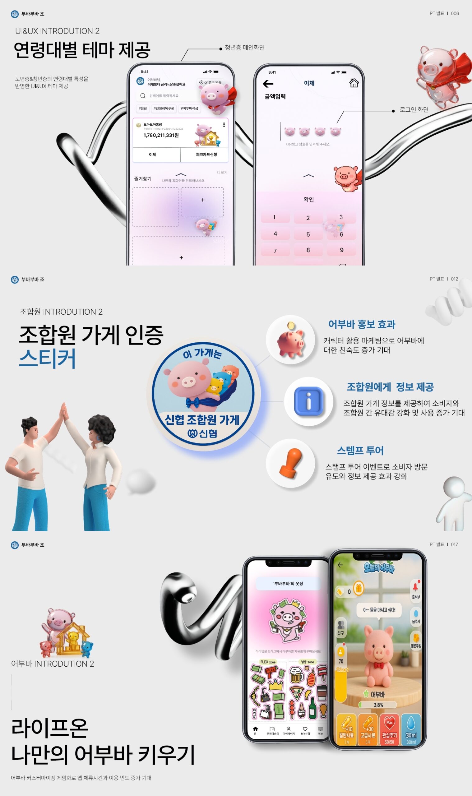 또한 ‘조합원 중심 커뮤니티’ 기능을 강화해, 지역 상권과 신협을 연결하고, 조합원 인증 스티커·스탬프 투어 등을 통해 참여형 금융 생태계를 구축하는 방안을 구상했다. 신협의 상징 캐릭터 ‘어부바’를 활용한 ‘나만의 어부바 키우기’ 서비스와 SNS 이벤트도 제안해 젊은 세대의 브랜드 친밀도를 높이는 전략을 구체화했다.