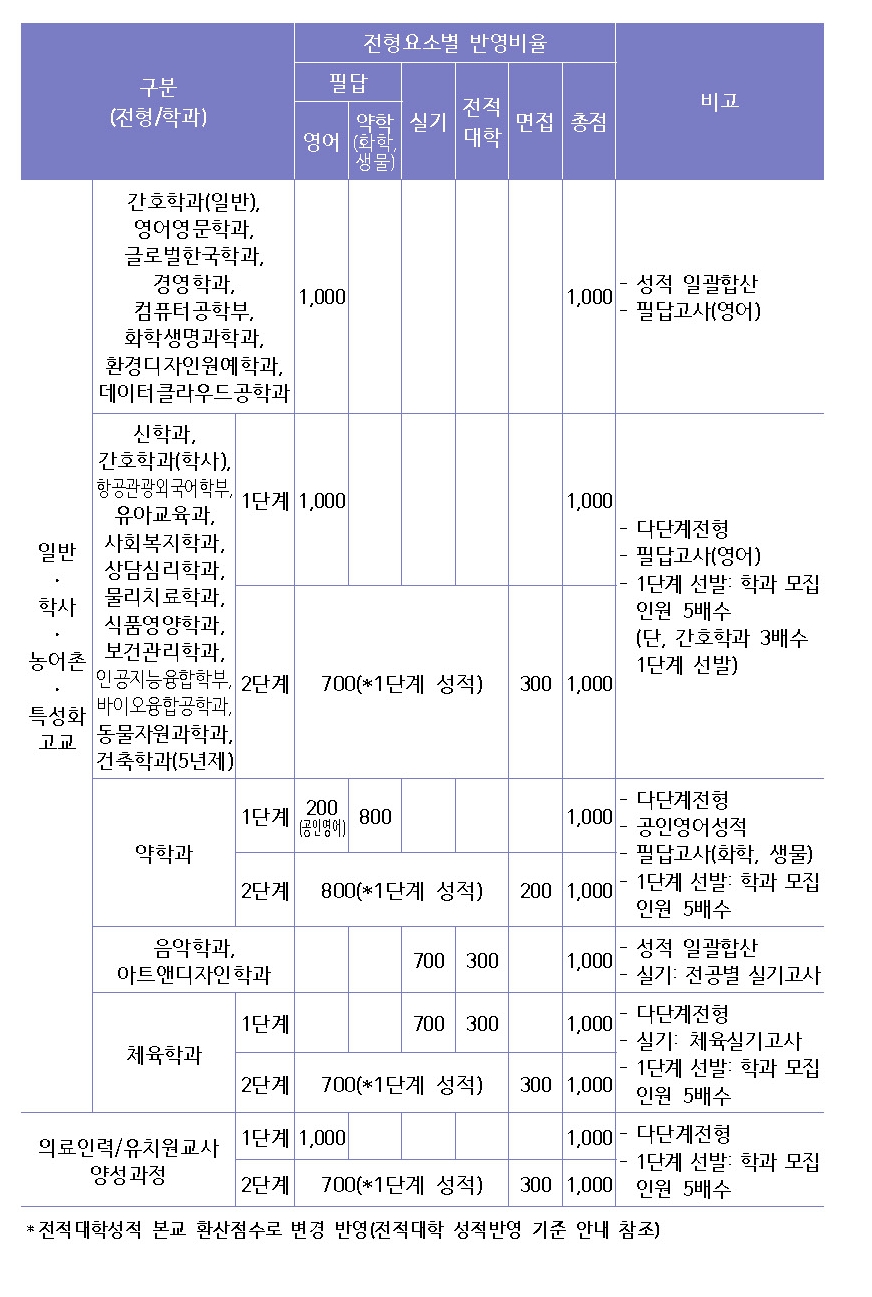 이와 달리, △신학과 △간호학과(학사편입) △항공관광외국어학부 △유아교육과 △사회복지학과 △상담심리학과 △물리치료학과 △식품영양학과 △보건관리학과 △인공지능융합학부 △바이오융합공학과 △동물자원과학과 △건축학과(5년제)는 1단계에서 영어 필답고사 성적으로 모집인원의 5배수(간호학과는 3배수)를 선발한다. 이후 2단계에서 1단계 성적 70%와 면접 30%를 최종 합산해 합격자를 가린다.