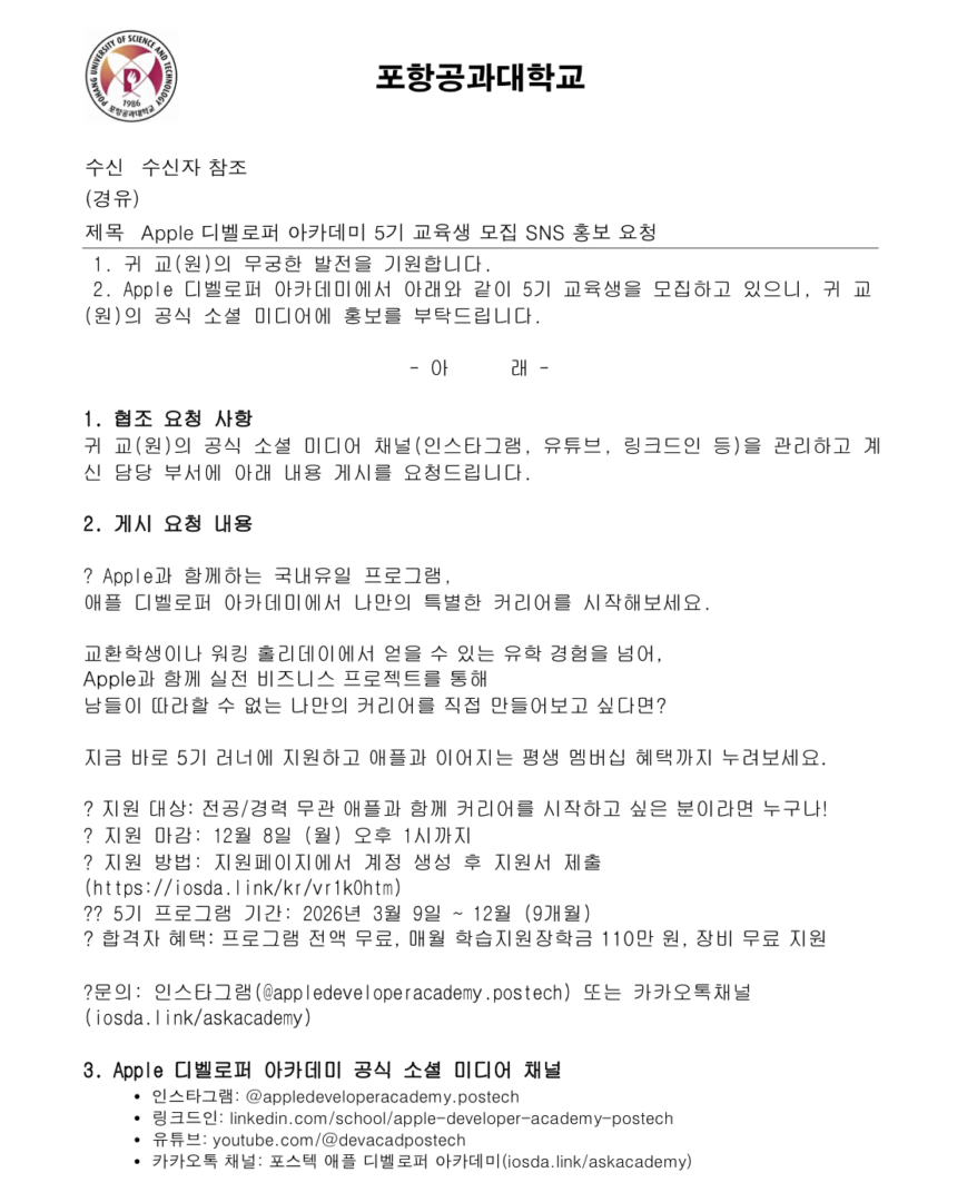 외부공지 [포항공과대학교]Apple 디벨로퍼 아카데미 5기 교육생 모집 안내 2025.12.05 조회수 4,826 취업지원팀 share facebook twitter kakaotalk 카카오톡 앱이설치된 모바일 기기에서만공유 가능합니다. https://www.syu.ac.kr/islq share 복사 facebook twitter kakaotalk 카카오톡 앱이설치된 모바일 기기에서만공유 가능합니다. 이전글 [인제대학교]인제대학교 정규직 직원 신규채용 안내 다음글 [국립국제교육원]2026년 국립국제교육원 특수외국어 교육 진흥사업 행정원(기간제 근로자) 채용 안내 목록