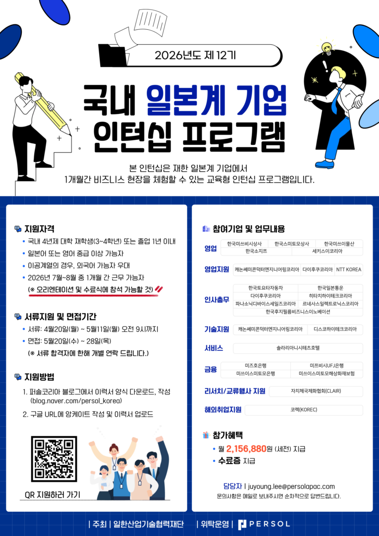 외부공지 [하계 인턴십] 국내일본계기업 인턴십 참가자 모집 안내 2026.04.22 조회수 135 취업지원팀 share facebook twitter kakaotalk 카카오톡 앱이설치된 모바일 기기에서만공유 가능합니다. https://www.syu.ac.kr/4g5k share 복사 facebook twitter kakaotalk 카카오톡 앱이설치된 모바일 기기에서만공유 가능합니다. 이전글 [SK그룹] 채용연계과정 SKALA 4기생성형 AI 서비스 개발 과정 모집 (~5/13(수) 17:00까지) 다음글 (주)한국능률협회컨설팅 채용 목록