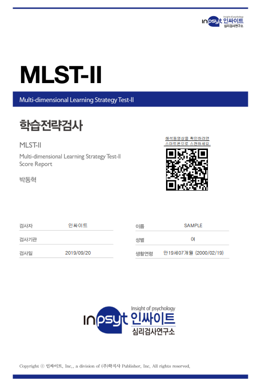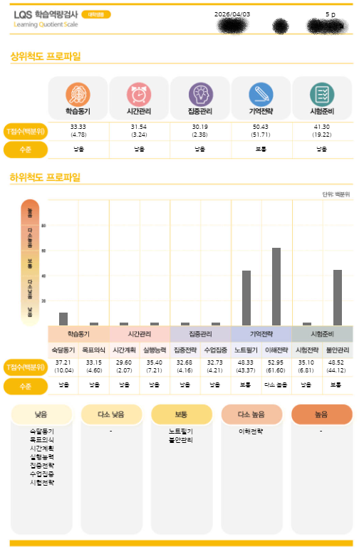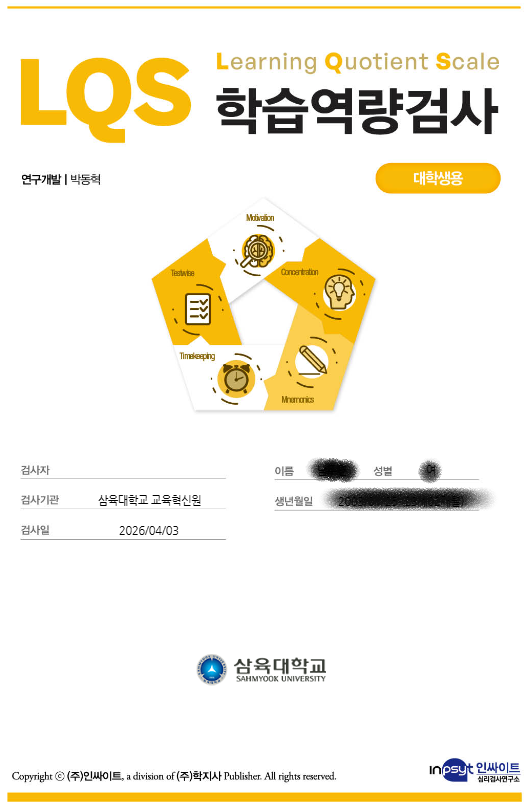 시간관리, 집중력, 공부 습관, 시험 준비 방식 등 개인의 학습전략 및 학습 습관을 점검하는 검사입니다.