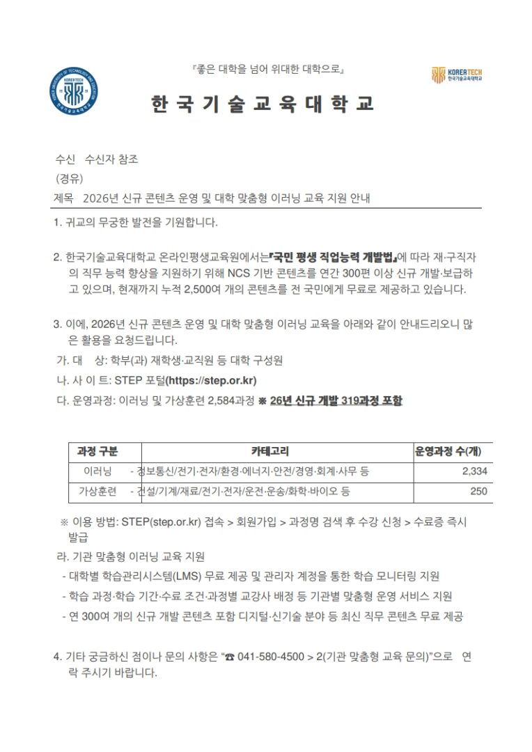 외부공지 [한국기술교육대학교] 2026년 신규 콘텐츠 운영 및 대학 맞춤형 이러닝 교육 지원 안내 2026.04.22 조회수 115 취업지원팀 share facebook twitter kakaotalk 카카오톡 앱이설치된 모바일 기기에서만공유 가능합니다. https://www.syu.ac.kr/ebuw share 복사 1.-STEP-전체-운영과정-목록-2026.04.xlsx (294.5 KB) 2.-기관-맞춤형-이러닝-연수-리플렛.pdf (2.2 MB) 3.-취업준비생-이러닝-과정-리플렛.pdf (436.7 KB) 4.-STEP-학습-우수사례집.pdf (13.6 MB) 5.-STEP스마트-직업훈련-플랫폼-안내.pdf (4.0 MB) facebook twitter kakaotalk 카카오톡 앱이설치된 모바일 기기에서만공유 가능합니다. 이전글 [국립한국해양대학교] 2026년 제2회 교육부(국립한국해양대학교) 청년인턴 채용 공고 다음글 [KOTRA] 2026 GLOBAL TALENT FAIR 채용박람회 구직자 모집 목록