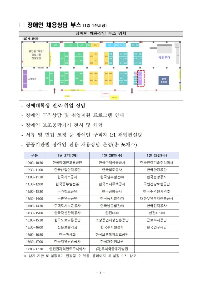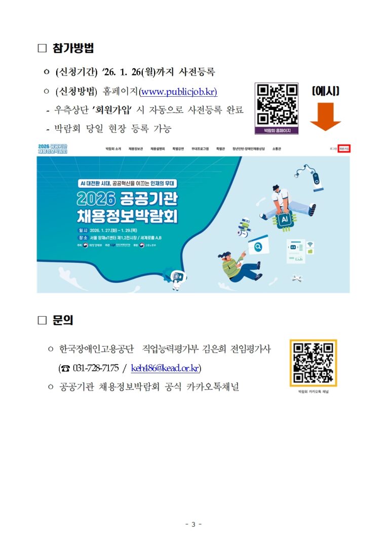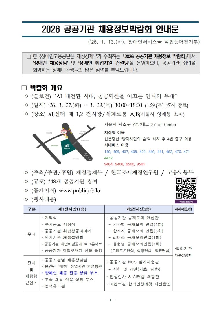 외부공지 [한국대학교육협의회]「2026 공공기관 채용정보박람회」 장애인 채용상담부스 운영 안내 2026.01.20 조회수 126 취업지원팀 share facebook twitter kakaotalk 카카오톡 앱이설치된 모바일 기기에서만공유 가능합니다. https://www.syu.ac.kr/n8uz share 복사 2026-공공기관-채용정보박람회-안내문.hwpx (2.0 MB) facebook twitter kakaotalk 카카오톡 앱이설치된 모바일 기기에서만공유 가능합니다. 이전글 [서울특별시]서울특별시 시간선택임기제공무원(지반침하조사 및 분석) 채용 안내 다음글 [한양여자대학교 대학일자리플러스센터] 졸업생특화프로그램 「생성형 AI를 활용한 취업준비 ABC」 홍보 안내 목록