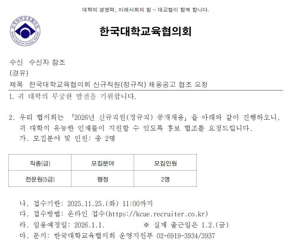 외부공지 [한국대학교육협의회]한국대학교육협의회 신규직원(정규직) 채용공고 안내 2025.11.11 조회수 22 취업지원팀 share facebook twitter kakaotalk 카카오톡 앱이설치된 모바일 기기에서만공유 가능합니다. https://www.syu.ac.kr/zb4d share 복사 2026년도-한국대학교육협의회-신규직원정규직-채용공고-복사.pdf (349.6 KB) 한국대학교육협의회한국대학교육협의회-신규직원정규직-채용공고-안내.png (103.4 KB) facebook twitter kakaotalk 카카오톡 앱이설치된 모바일 기기에서만공유 가능합니다. 이전글 글이 없습니다. 다음글 행사2025 건강도시 릴레이 이벤트 ‘AED를 찾아서’ 목록