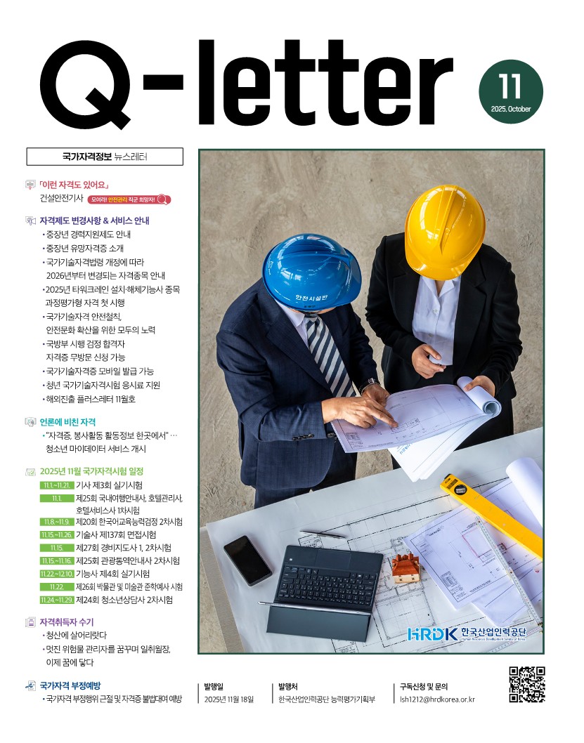 외부공지 [한국산업인력공단]국가자격동향지(Q-letter) 2025년 11월호 안내 2025.11.21 조회수 17 취업지원팀 share facebook twitter kakaotalk 카카오톡 앱이설치된 모바일 기기에서만공유 가능합니다. https://www.syu.ac.kr/i2pk share 복사 붙임3-국가자격동향지Q-letter-2025년-11월호_저용량.pdf (7.3 MB) facebook twitter kakaotalk 카카오톡 앱이설치된 모바일 기기에서만공유 가능합니다. 이전글 글이 없습니다. 다음글 [서울지방고용노동청]서울고용노동청과 함께하는 취업준비콘서트_일자리톡톡[삼성바이오로직스] 홍보 안내 목록