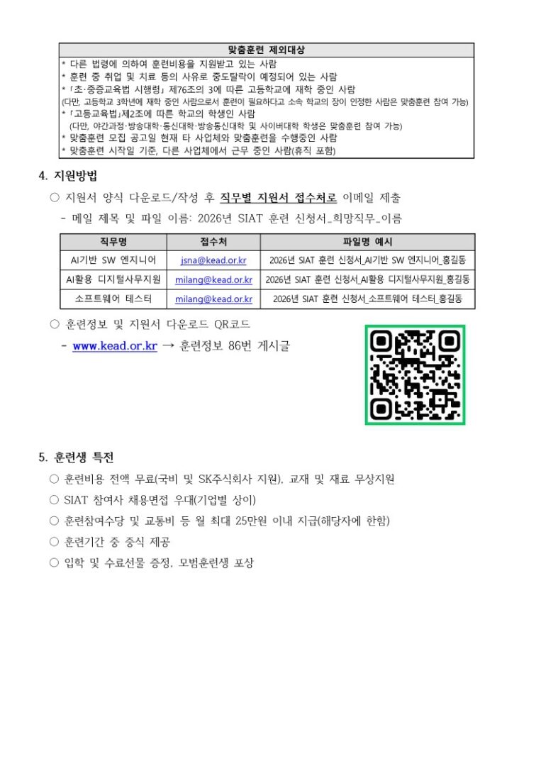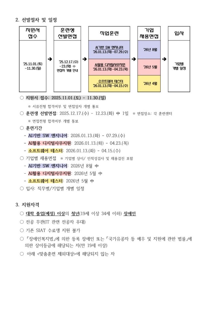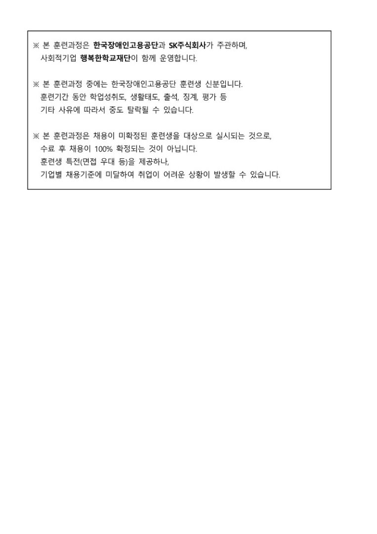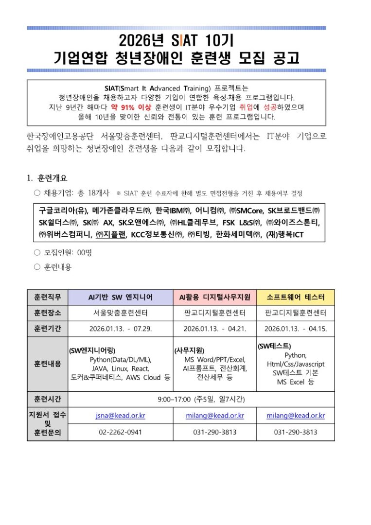 외부공지 [한국장애인고용공단]〔장애인 일자리〕2026년 구글코리아 등 기업연합 청년장애인 채용연계 훈련생(씨앗훈련) 모집 안내 2025.11.18 조회수 15 취업지원팀 share facebook twitter kakaotalk 카카오톡 앱이설치된 모바일 기기에서만공유 가능합니다. https://www.syu.ac.kr/08x7 share 복사 붙임2.-2026년-SIAT-훈련-신청서_희망직무_이름.hwp (59.5 KB) facebook twitter kakaotalk 카카오톡 앱이설치된 모바일 기기에서만공유 가능합니다. 이전글 [유네스코국제무예센터]2025년 제3회 유네스코국제무예센터 직원(정규직) 채용 공고 안내 다음글 [서울특별시교육청]공립유치원 방과후 과정(에듀케어) 운영 인력 채용 홍보 안내 목록