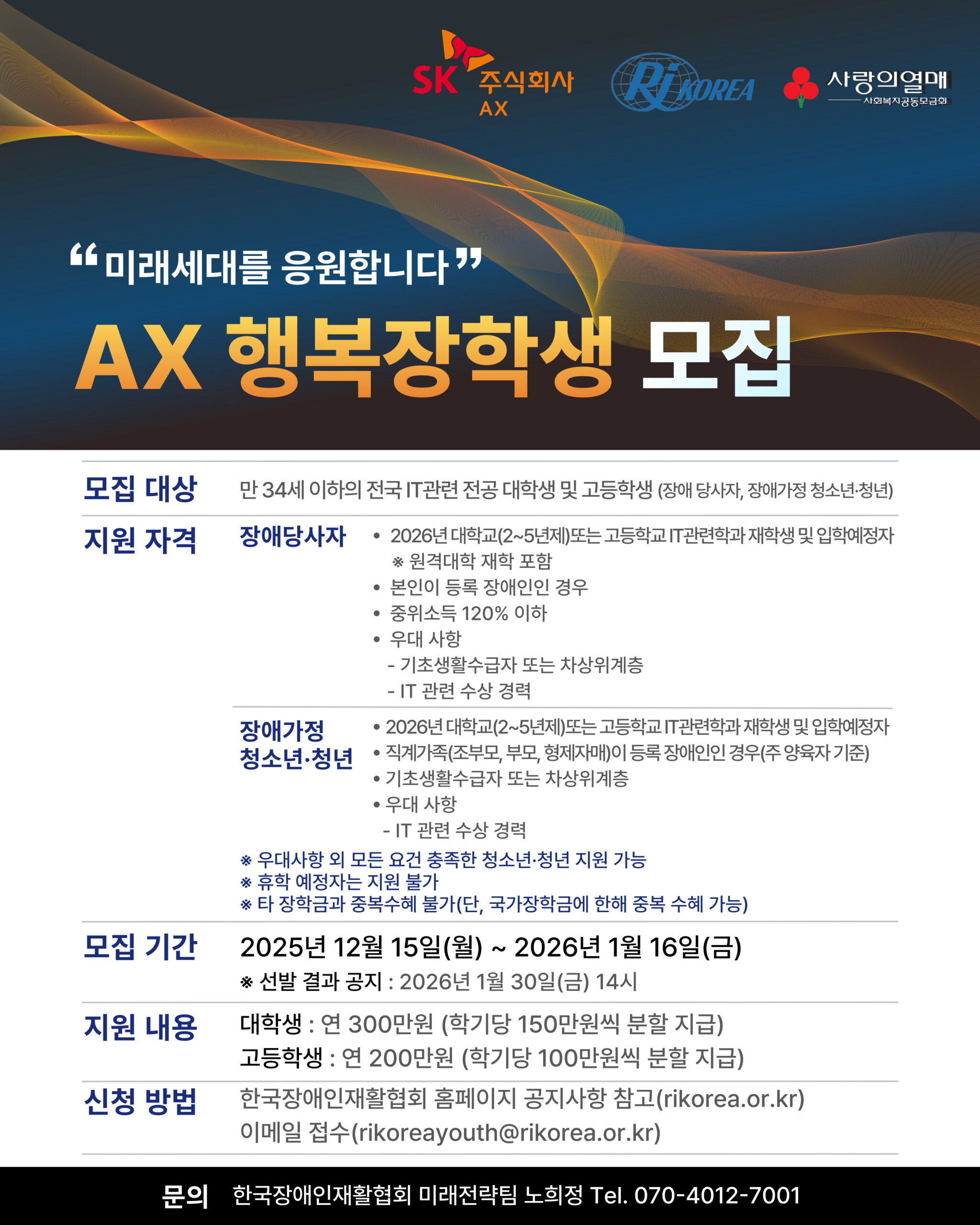 장학공지 [한국장애인재활협회] 2026 SK(주) AX 행복장학생 모집 안내 2025.12.23 조회수 179 학생처 share facebook twitter kakaotalk 카카오톡 앱이설치된 모바일 기기에서만공유 가능합니다. https://www.syu.ac.kr/ea71 share 복사 I 2026 SK(주) AX 행복장학생 모집 I 상세 내용은 아래 및 첨부파일을 확인하시어 반드시 해당 기관(단체)에 문의 혹은 홈페이지를 참고하시기 바랍니다. (아래의 그림을 클릭 시 해당 기관 홈페이지로 이동됩니다) 붙임1.-AX행복장학생-모집-안내문-및-신청서식.hwp (68.0 KB) 붙임3.-참고자료AX행복장학생-지원-가능-IT계열-고등학교-목록-scaled.jpg (768.9 KB) 붙임2.-AX행복장학생-모집-안내문-및-신청서식줄글형.hwp (62.0 KB) facebook twitter kakaotalk 카카오톡 앱이설치된 모바일 기기에서만공유 가능합니다. 이전글 글이 없습니다. 다음글 [농어촌희망재단] 2026년 1학기 농림축산식품부 대학장학금 선발 안내 목록