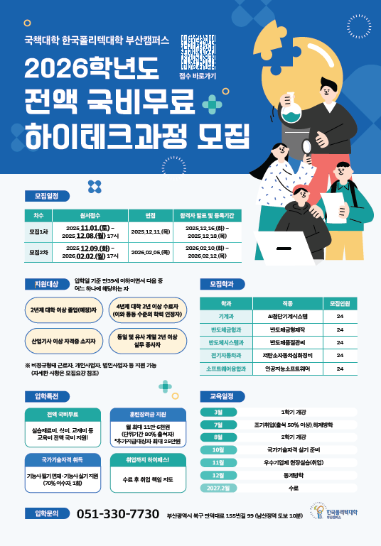 외부공지 [한국폴리텍대학]2026학년도 국비무료 청년취업연계 하이테크과정 안내 2025.11.04 조회수 31 취업지원팀 share facebook twitter kakaotalk 카카오톡 앱이설치된 모바일 기기에서만공유 가능합니다. https://www.syu.ac.kr/aihc share 복사 한국폴리텍대학2026학년도-국비무료-청년취업연계-하이테크과정-안내-1.png (75.3 KB) 한국폴리텍대학2026학년도-국비무료-청년취업연계-하이테크과정-안내-2.png (70.9 KB) facebook twitter kakaotalk 카카오톡 앱이설치된 모바일 기기에서만공유 가능합니다. 이전글 [관악구]2025년「관악구 청년성장프로젝트(청년카페) 11월(1차) 참여자 모집」안내 다음글 [한식진흥원] 기업탐방 프로그램 홍보 목록