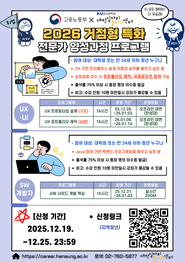 외부공지 [한성대학교][한성대학교 / 대학일자리플러스센터] 거점형 특화프로그램 홍보 안내 2025.12.23 조회수 34 취업지원팀 share facebook twitter kakaotalk 카카오톡 앱이설치된 모바일 기기에서만공유 가능합니다. https://www.syu.ac.kr/ku78 share 복사 facebook twitter kakaotalk 카카오톡 앱이설치된 모바일 기기에서만공유 가능합니다. 이전글 글이 없습니다. 다음글 [한국보건의료정보원]나의건강기록 앱 ‘활용 경험’ 및 ‘발전 아이디어’ 공모전 안내 및 홍보 안내 목록