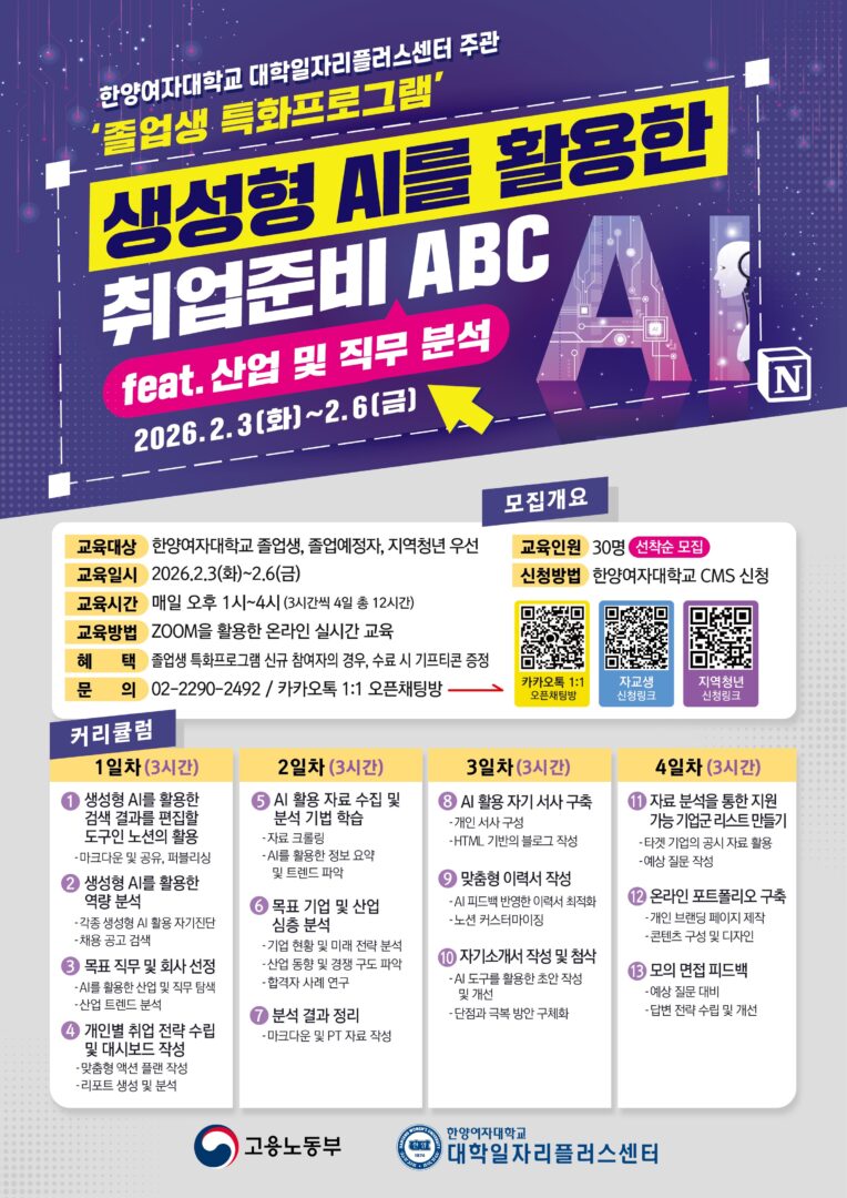 외부공지 [한양여자대학교 대학일자리플러스센터] 졸업생특화프로그램 「생성형 AI를 활용한 취업준비 ABC」 홍보 안내 2026.01.20 조회수 163 취업지원팀 share facebook twitter kakaotalk 카카오톡 앱이설치된 모바일 기기에서만공유 가능합니다. https://www.syu.ac.kr/lfw2 share 복사 facebook twitter kakaotalk 카카오톡 앱이설치된 모바일 기기에서만공유 가능합니다. 이전글 글이 없습니다. 다음글 [한국보건복지인재원]2026년「제1기 감염병매개모기감시과정」외 1과정 교육생 모집 안내 목록