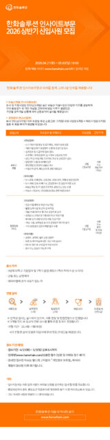26년 한화솔루션 인사이트부문 상반기 신입사원 모집 26년 한화솔루션 인사이트부문 상반기 신입사원 모집 2026.04.22 조회수 0 취업지원팀 share facebook twitter kakaotalk 카카오톡 앱이설치된 모바일 기기에서만공유 가능합니다. https://www.syu.ac.kr/?p=244208 share 복사 facebook twitter kakaotalk 카카오톡 앱이설치된 모바일 기기에서만공유 가능합니다. 이전글 글이 없습니다. 다음글 글이 없습니다. 목록
