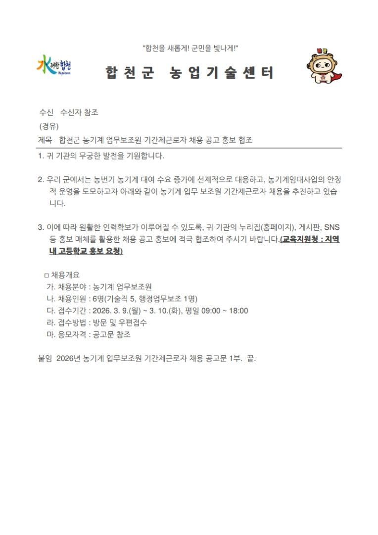 외부공지 [합천군] 2026년 농기계 업무보조원 기간제근로자 채용 공고 2026.02.24 조회수 1,894 취업지원팀 share facebook twitter kakaotalk 카카오톡 앱이설치된 모바일 기기에서만공유 가능합니다. https://www.syu.ac.kr/mjm0 share 복사 2026년-농기계-업무보조원-기간제근로자-채용-공고문2차.hwp (119.0 KB) facebook twitter kakaotalk 카카오톡 앱이설치된 모바일 기기에서만공유 가능합니다. 이전글 2026년 제3회 여주시 지방임기제공무원 임용시험 공고 홍보 요 다음글 2026년 [2급 치유농업사 양성 과정] 교육생 모집 안내 목록