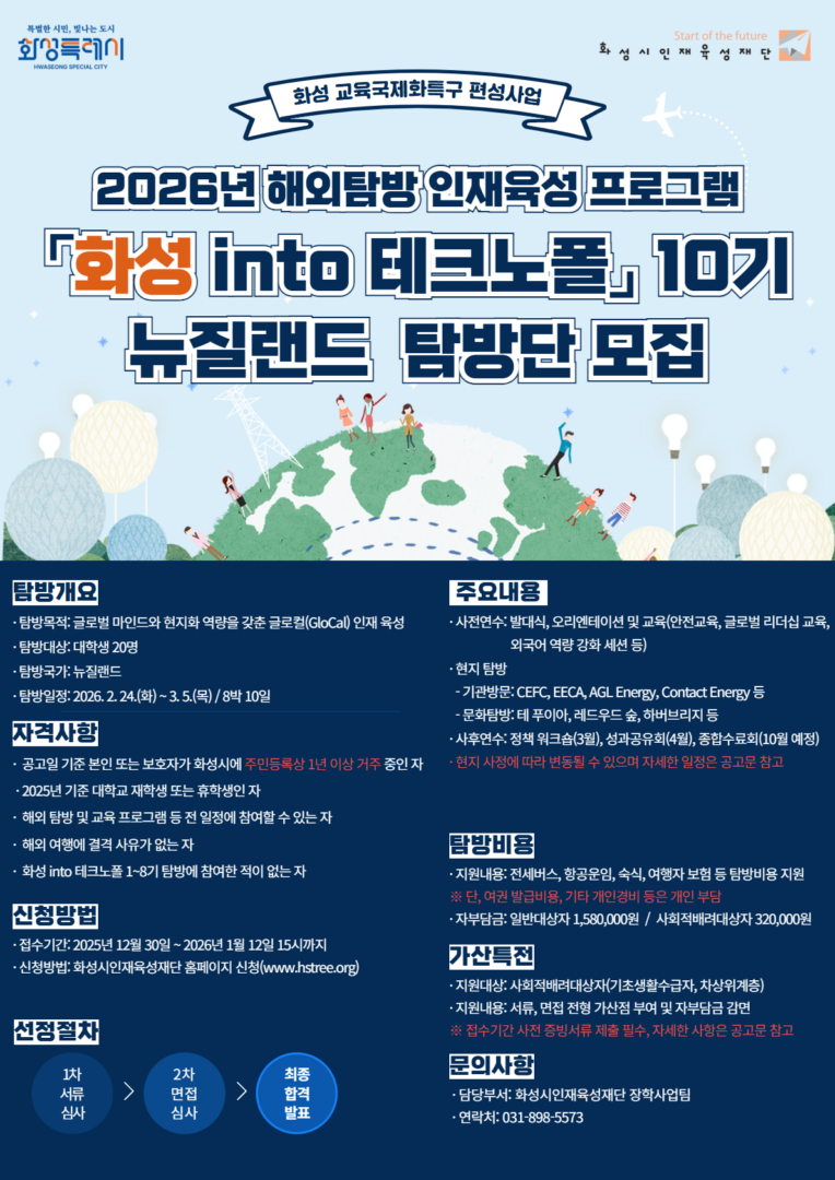 외부공지 [화성시인재육성재단]2026년 화성 into 테크노폴 10기 뉴질랜드 탐방단 모집 안내 2025.12.26 조회수 27 취업지원팀 share facebook twitter kakaotalk 카카오톡 앱이설치된 모바일 기기에서만공유 가능합니다. https://www.syu.ac.kr/kufd share 복사 facebook twitter kakaotalk 카카오톡 앱이설치된 모바일 기기에서만공유 가능합니다. 이전글 [서 울 특 별 시]『2026 서울 매력일자리 사업』 통합공고에 따른 참여자 모집 안내 다음글 [예천문화관광재단]2026년도 제1회 기간제근로자(지역관광추진조직 육성사업) 채용 공고 안내 목록