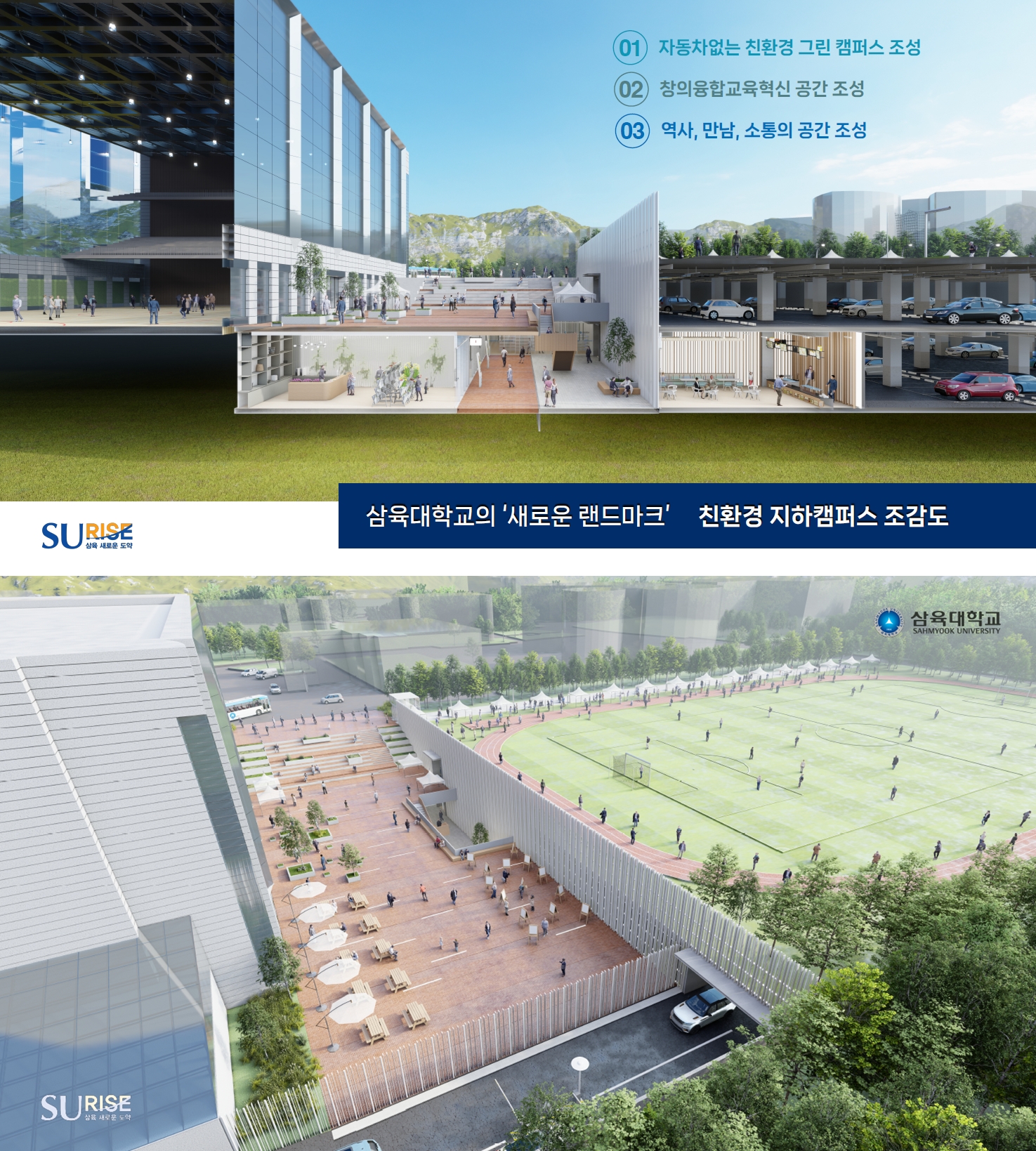 ‘SU-RISE 프로젝트’는 지하캠퍼스 구축을 골자로 한 대형 공간혁신 구상이다. 한정된 교내 공간을 지하 복합단지로 확장하고, 지상은 녹지로 조성해 자동차 없는 탄소제로 캠퍼스로 전환한다.