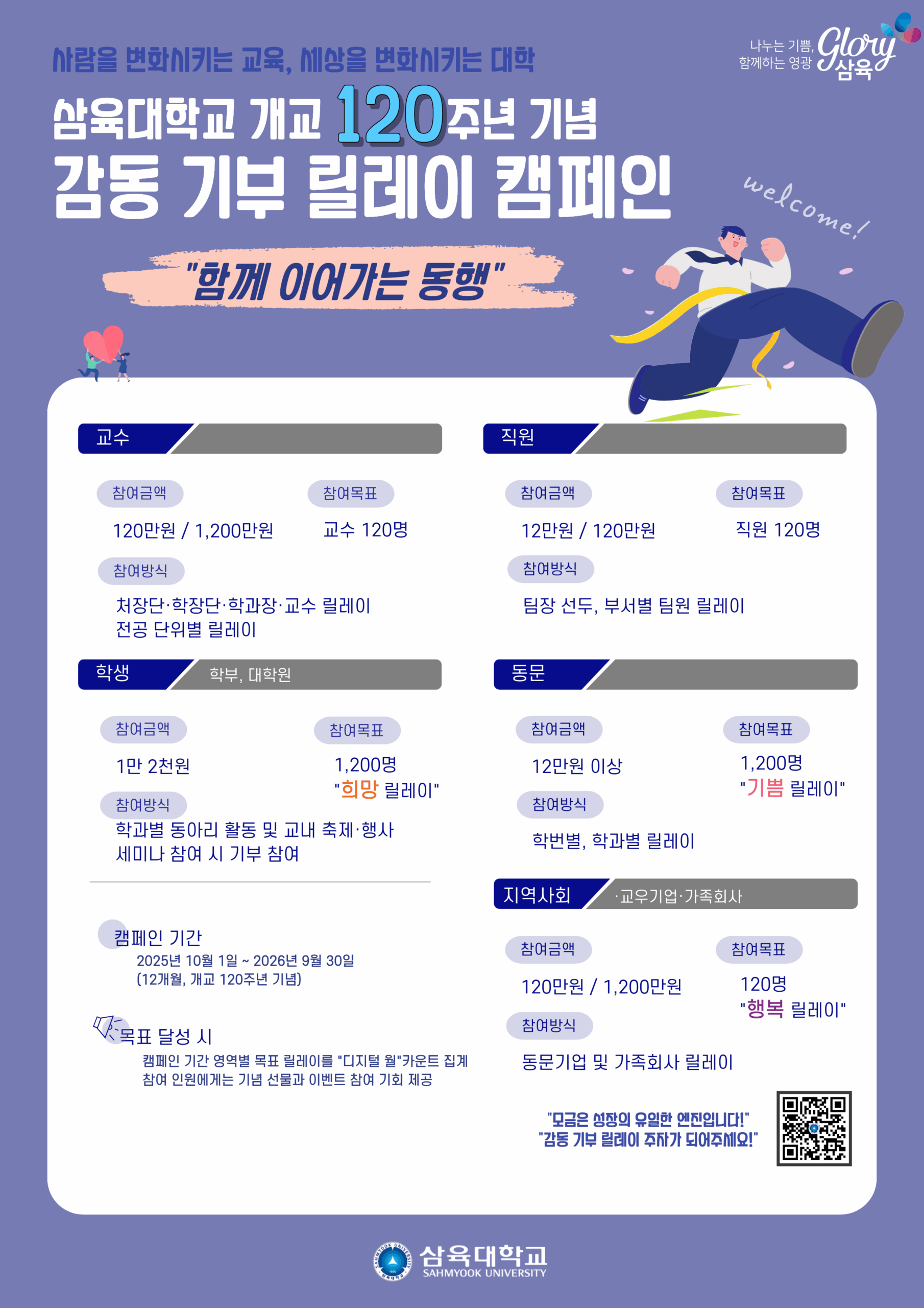 교내 캠페인 슬로건은 ‘함께 이어가는 동행’이다. 교수·직원·재학생·동문·지역사회(동문기업·가족회사) 등이 주요 참여 대상이다. 참여 방식은 각 그룹별 ‘릴레이 응원봉 전달’ 형식으로 진행된다.