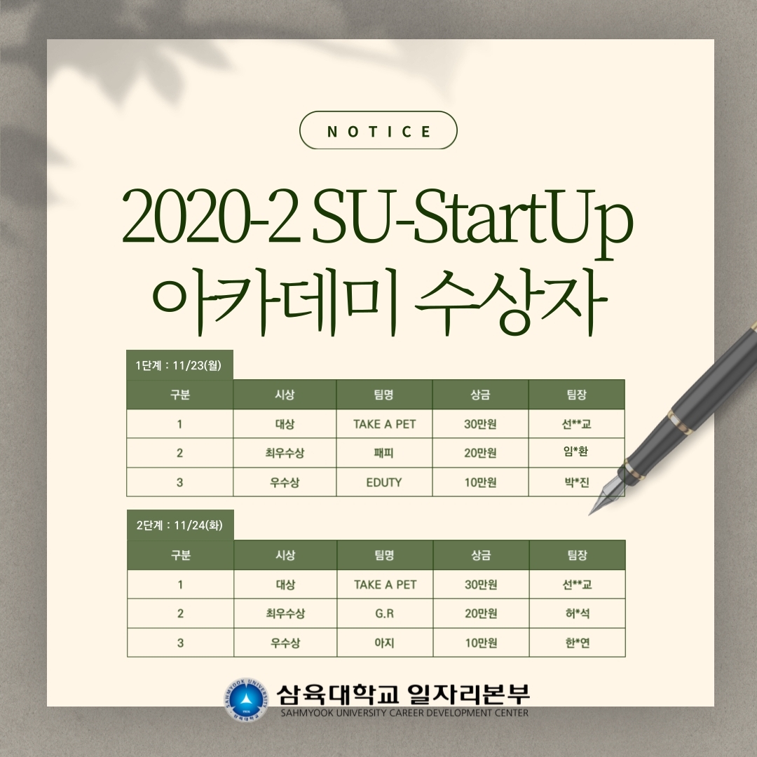 취업·창업공지 알림 2020-2 SU-StartUp 아카데미 수상자 발표 2020.12.01 조회수 4,291 창업지원단 share facebook twitter kakaotalk 카카오톡 앱이설치된 모바일 기기에서만공유 가능합니다. https://www.syu.ac.kr/?p=90751 share 복사 2020-2 SU-StartUp 아카데미 수상자를 아래와 같이 발표합니다. 수상을 축하합니다! facebook twitter kakaotalk 카카오톡 앱이설치된 모바일 기기에서만공유 가능합니다. 이전글 알림2020 동계방학(12월, 1월) 취업프로그램 일정 다음글 알림[1분 자기소개] 영상 공모전 수상자 발표 목록