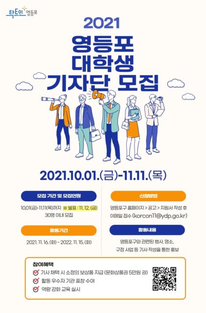 외부공지 구인 2021 영등포구 대학생 명예기자단 모집 홍보 안내 2021.10.01 조회수 6,588 학생처 share facebook twitter kakaotalk 카카오톡 앱이설치된 모바일 기기에서만공유 가능합니다. https://www.syu.ac.kr/?p=107393 share 복사 2021 영등포구 대학생 명예기자단 모집 홍보 안내입니다. 첨부된 파일을 참조하여 주시길 바랍니다. 2021-대학생명예기자단-지원신청서.hwp (17.5 KB) 2021-영등포구-대학생기자단-모집-포스터.jpg (471.1 KB) 2021-대학생명예기자단-모집-안내문.hwp (15.0 KB) facebook twitter kakaotalk 카카오톡 앱이설치된 모바일 기기에서만공유 가능합니다. 이전글 구인노원 청년가게 7,8호점 운영자 모집 홍보 안내 다음글 구인[서울시 교육정책과] 서울런 온라인 멘토단 2차모집 및 홍보 안내 목록