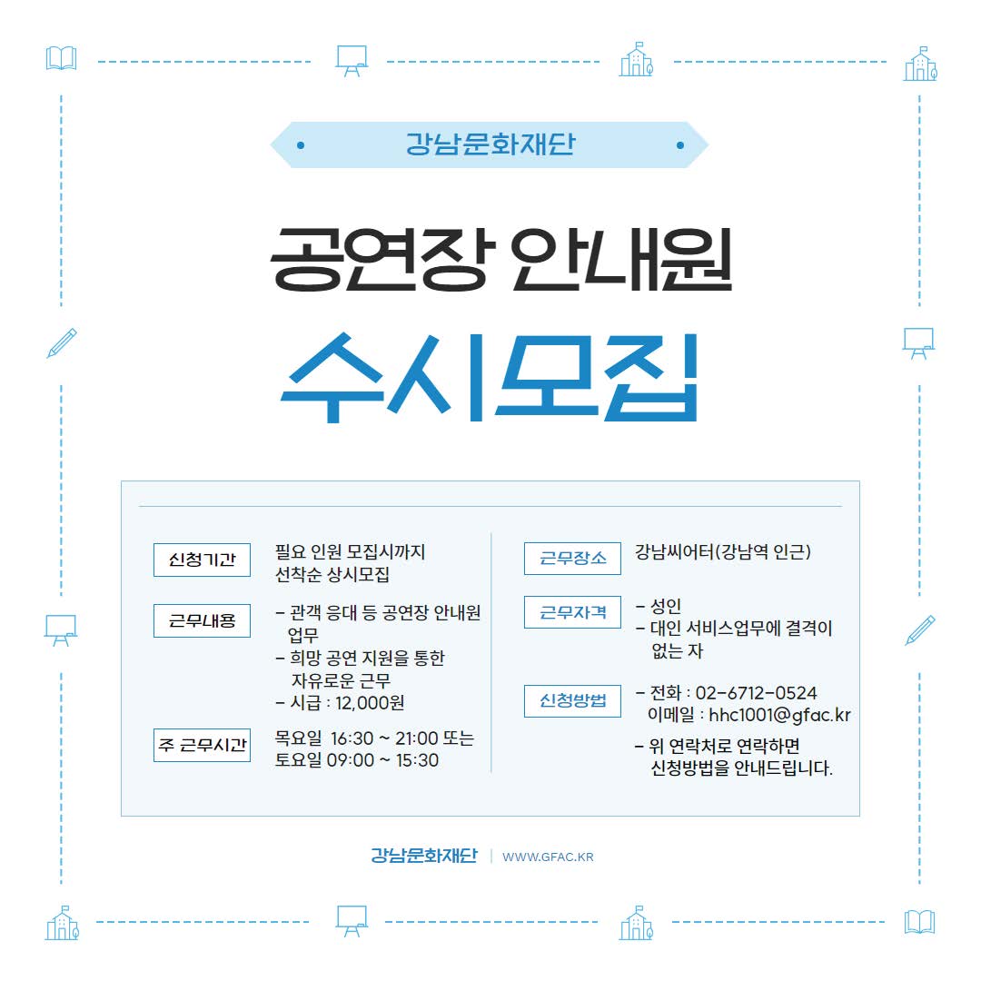 외부공지 행사 2023년 강남문화재단 공연장 안내원 모집 안내 2023.06.14 조회수 3,523 학생처 share facebook twitter kakaotalk 카카오톡 앱이설치된 모바일 기기에서만공유 가능합니다. https://www.syu.ac.kr/?p=147468 share 복사 facebook twitter kakaotalk 카카오톡 앱이설치된 모바일 기기에서만공유 가능합니다. 이전글 행사2023년 영광법성포단오제 행사일정 안내 다음글 행사『2023. 제2회 불후의 명강』 강연안내 목록