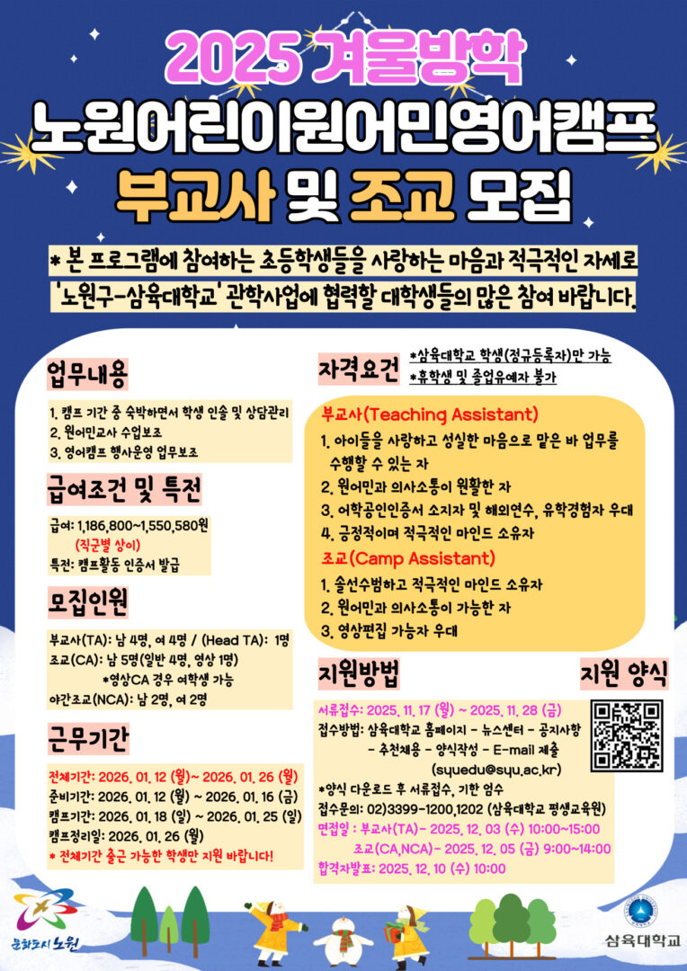 2025년 겨울 노원어린이원어민영어캠프 부교사 및 조교를 모집합니다.