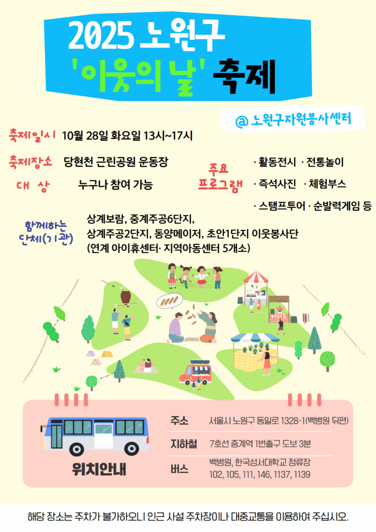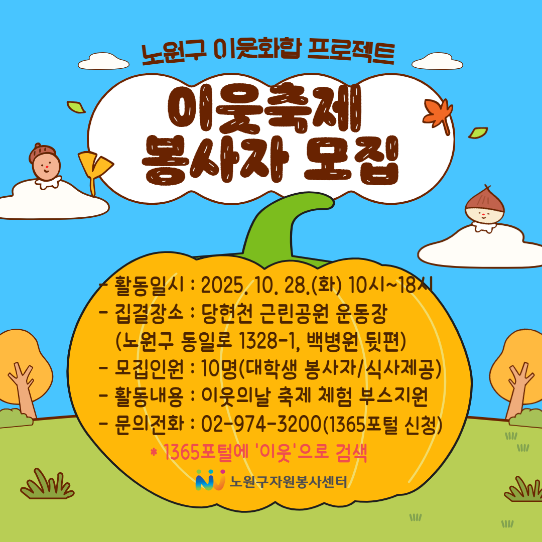 외부공지 2025 노원구 ‘이웃의 날’ 축제 봉사자 모집 2025.10.21 조회수 72 글로컬사회혁신원 share facebook twitter kakaotalk 카카오톡 앱이설치된 모바일 기기에서만공유 가능합니다. https://www.syu.ac.kr/00r1 share 복사 노원구 자원봉사센터에서 2025 노원구 ‘이웃의 날’ 축제 봉사자를 모집하오니 많은 관심 바랍니다. 이웃의-날-축제-봉사자-모집-홍보지-2.png (222.7 KB) 이웃축제-포스터.png (310.4 KB) facebook twitter kakaotalk 카카오톡 앱이설치된 모바일 기기에서만공유 가능합니다. 이전글 동남아 지역 불법, 사기 취업 주의 안내 다음글 2025년 하반기 농심그룹 채용 ~10/29 목록