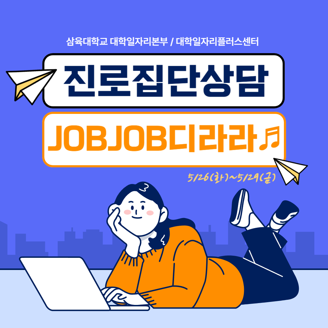 [진로집단상담 JOBJOB디라라♬]5/26(화)-5/28(목) 17:00-19:00, 5/29(금) 13:00-15:00 에, 대면 으로 운영됩니다. 관심 있는 학생들의 많은 참여 바랍니다 🙂