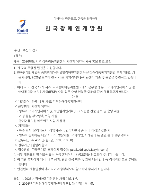 외부공지 2026년도 지역 장애아동지원센터 기간제 계약직 채용 2026.02.11 조회수 216 취업지원팀 share facebook twitter kakaotalk 카카오톡 앱이설치된 모바일 기기에서만공유 가능합니다. https://www.syu.ac.kr/bp78 share 복사 붙임1.-2026년-장애아동지원센터-사업-개요.hwp (82.5 KB) 붙임2.-2026년-지역장애아동지원센터-채용-일정수정.hwp (76.0 KB) facebook twitter kakaotalk 카카오톡 앱이설치된 모바일 기기에서만공유 가능합니다. 이전글 2026년도 한국연구재단 체험형 청년인턴(장애) 채용 공고 다음글 2026년 ‘미래 성장산업 취업전환 사업’ 무료 취업교육생 모집공고 목록