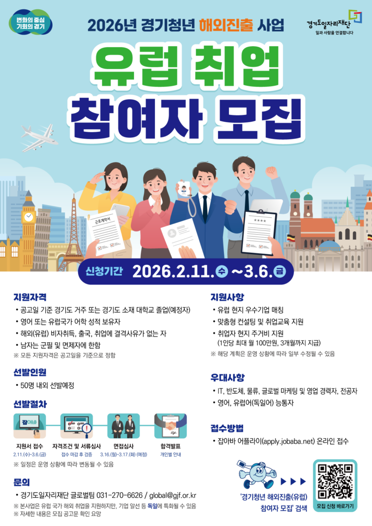 외부공지 2026년 경기청년 해외진출(유럽) 사업 참여자 모집 2026.02.12 조회수 280 취업지원팀 share facebook twitter kakaotalk 카카오톡 앱이설치된 모바일 기기에서만공유 가능합니다. https://www.syu.ac.kr/4fr4 share 복사 붙임-2026년-경기청년-해외진출유럽-사업-참여자-모집-공고문.pdf (98.4 KB) facebook twitter kakaotalk 카카오톡 앱이설치된 모바일 기기에서만공유 가능합니다. 이전글 2026년 안동문화예술의전당 무대예술팀 기간제 근로자 모집 공고 다음글 2026 서울고용노동청과 함께하는 취업준비콘서트_일자리톡톡[유니클로] 목록