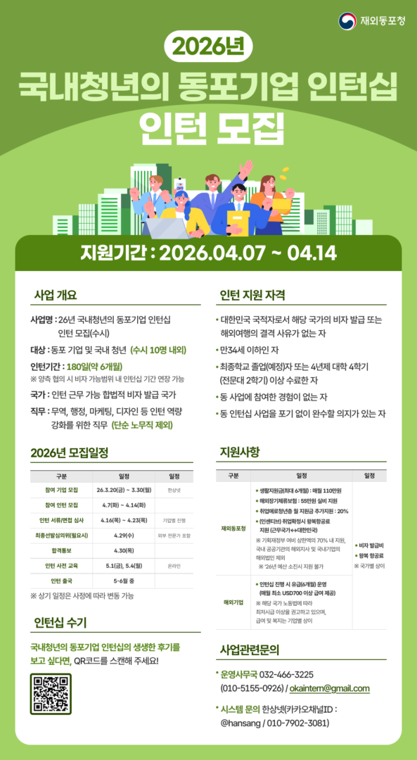외부공지 2026년 국내청년의 동포기업 인턴십 인턴 모집 2026.04.02 조회수 980 취업지원팀 share facebook twitter kakaotalk 카카오톡 앱이설치된 모바일 기기에서만공유 가능합니다. https://www.syu.ac.kr/nida share 복사 ★2026년-국내청년의-동포기업-인턴십-인턴모집-공고수시.hwpx (53.0 KB) ★2026년-국내청년의-동포기업-인턴십-인턴모집-공고수시.pdf (137.1 KB) facebook twitter kakaotalk 카카오톡 앱이설치된 모바일 기기에서만공유 가능합니다. 이전글 서울고용노동청과 함께하는 취업준비콘서트 일자리톡톡 다음글 2026년 4월 국가데이터인재개발원 이러닝 과정 운영 안내 목록