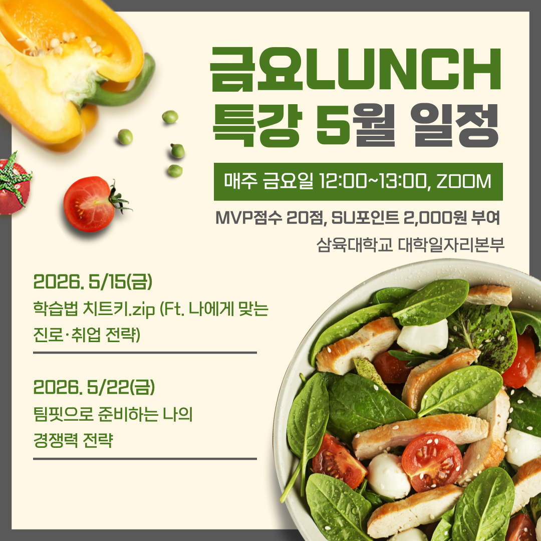 삼육대학교 대학일자리본부에서는 취업 준비를 하면 꼭 준비해야할 사항들을 주제로 아래와 같이 [금요 [LUNCH특강]을 운영합니다.